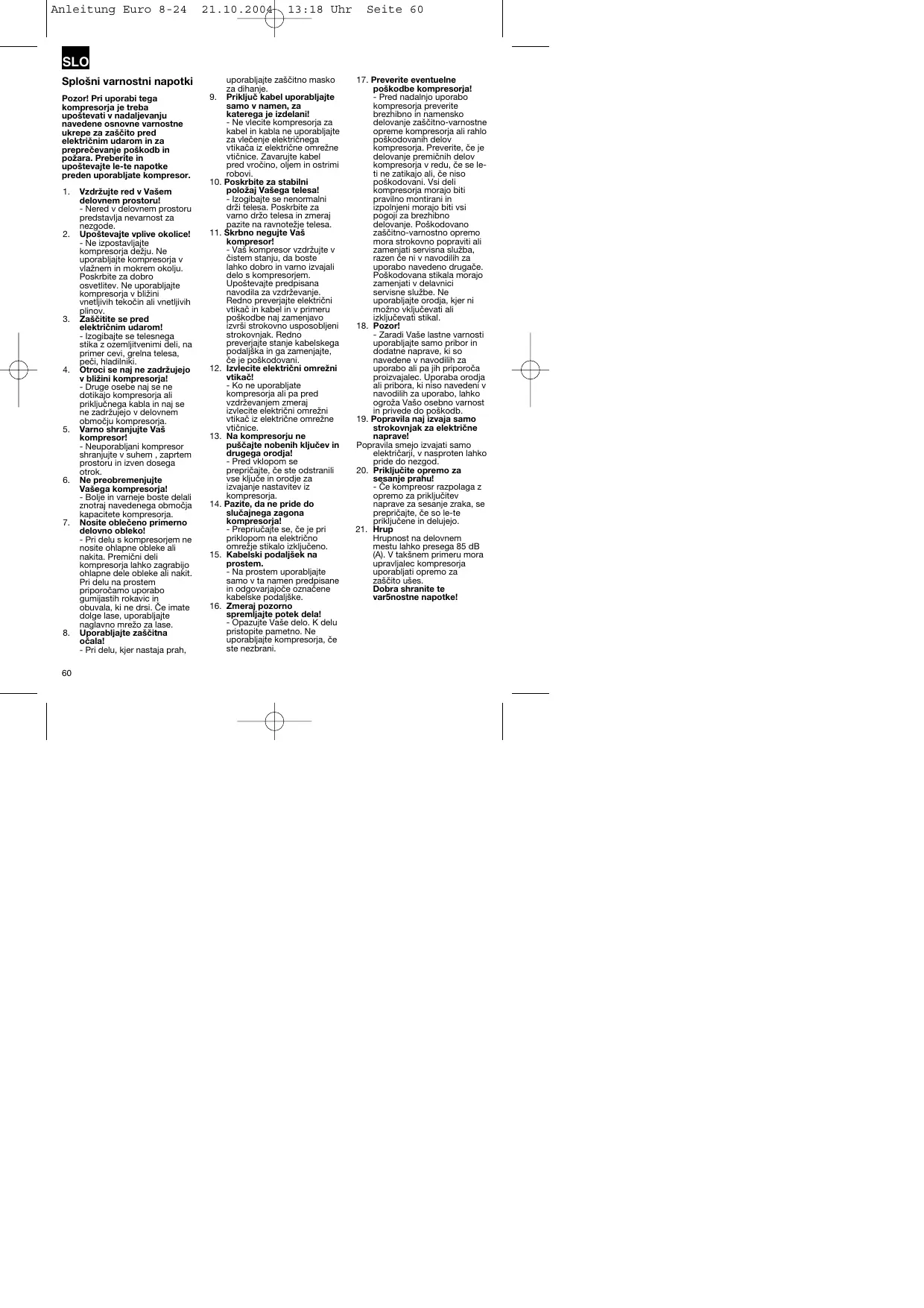 1. Maintenez la zone de travail en ordre. - Le désordre dans la zone de travail augmente le risque d’accident. 2. Prenez les influences de l’environnement en considération. N’exposez pas le compresseur à la pluie. Ne l’utilisez pas dans un environnement humide ou détrempé. Veillez à un bon éclairage. N’utilisez pas le compresseur à proximité de liquides ou gaz inflammables. 3. Protégez-vous contre le choc électrique. - Evitez le contact avec des pièces mises à la terre, telles que les tubes, les appareils de chauffage, les cuisinières électriques ou les réfrigérateurs. 4. Tenez les enfants éloignés! - Prenez soin que d’autres personnes ne touchent pas le compresseur ou le câble. Tenez-les à l’écart de votre zone de travail. 5. Conservez votre compresseur à un endroit sûr. - Il est conseillé de conserver le compresseur non utilisé dans un local sec et fermé et inaccessible aux enfants. 6. Ne surchargez pas votre compresseur. - Vous travaillez mieux et plus sûrement dans la gamme de puissance indiquée. 7. Portez des vêtements de travail appropriés. - Ne portez pas de vêtements larges ou de bijoux. Ils pourraient être happés par des pièces mobiles. Il est recommandable de porter des gants en caoutchouc et des chaussures antiglissantes pendant les travaux à l’extérieur. Si vous avez les cheveux longs, portez un filet. 12