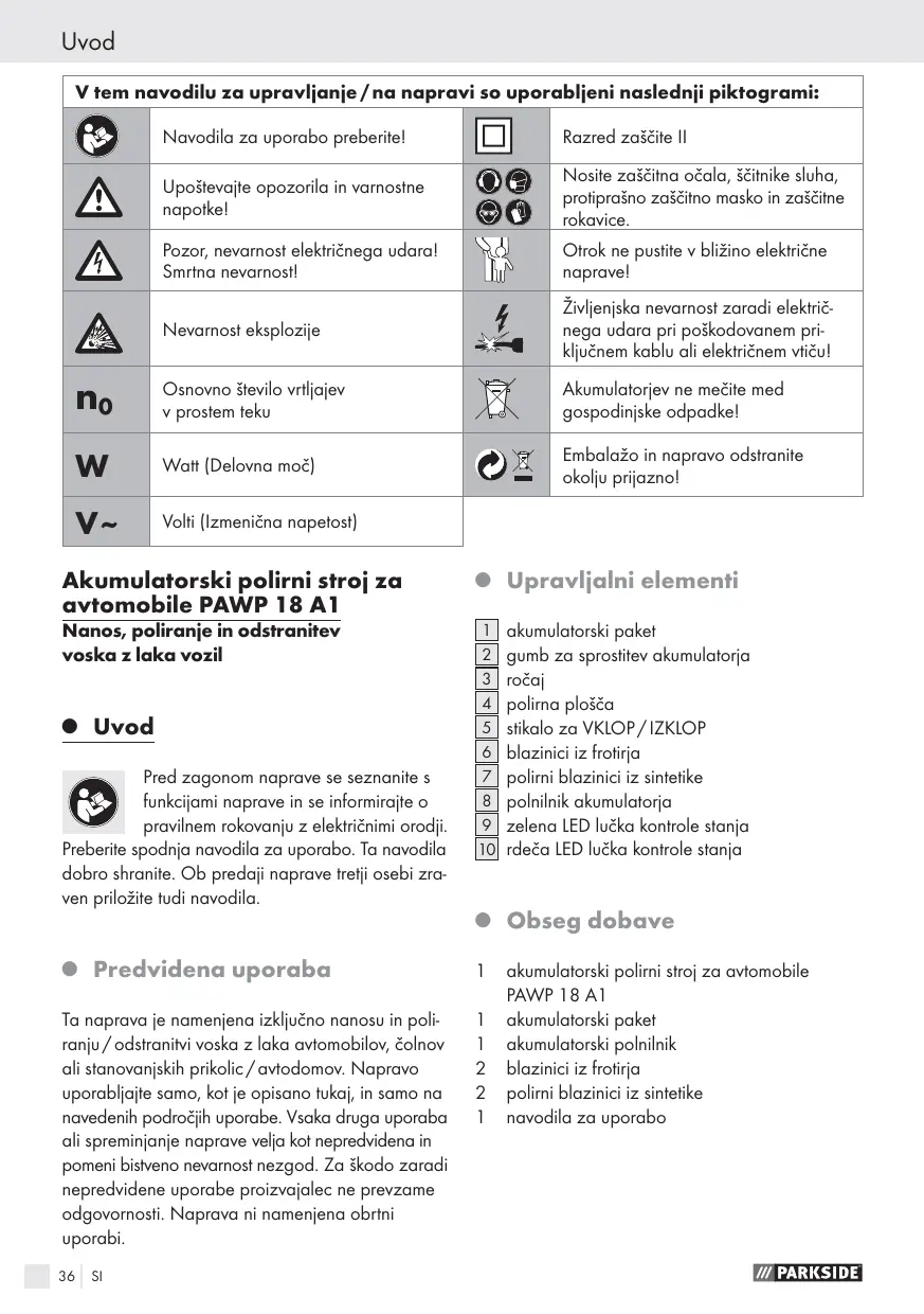 Ta naprava je namenjena izkljuëno nanosu in poli: ranju / odstranitvi voska z laka avtomobilov, éolnov ali stanovanjskih prikolic / avodomov. Napravo uporabliajte samo, kot je opisano tukai, in samo na navedenih podroëjih uporabe. Vsaka druga uporaba ali spreminjanie naprave velja kot nepredvidena in pomeni bistveno nevarnost nezgod. Za ëkodo zaradi nepredvidene uporabe proizvajalec ne prevzame odgovornosti. Naprava ni namenjena obrini uporabi.