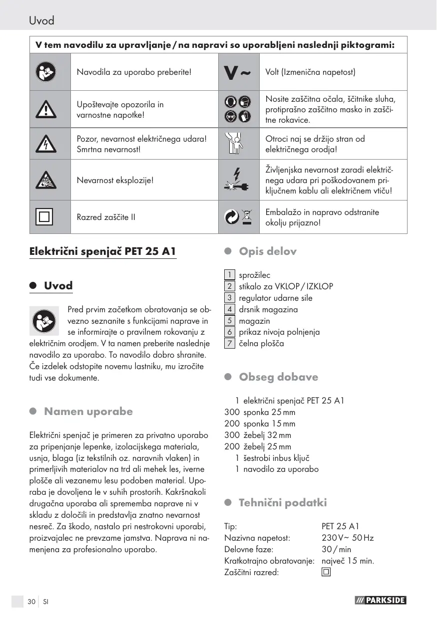 Téléchargez la notice de votre Električno orodje au format PDF gratuitement ! Retrouvez votre notice PET 25 A1 ELECTRIC NAILER-STAPLER - PARKSIDE et reprennez votre appareil électronique en main. Sur cette page sont publiés tous les documents nécessaires à l'utilisation de votre appareil PET 25 A1 ELECTRIC NAILER-STAPLER de la marque PARKSIDE.