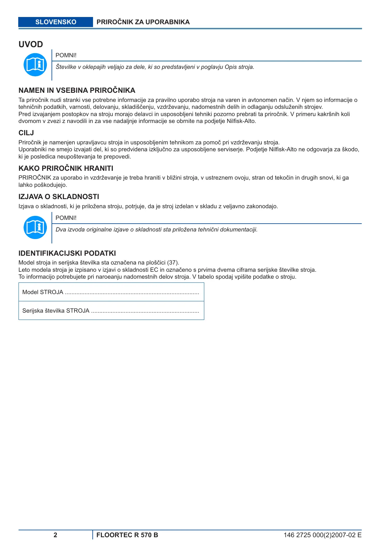 Pred izvajanjem postopkov na stroju morajo delavci in usposobljeni tehniki pozorno prebrati ta priroënik. V primeru kakrënih koli dvomom v zvezi z navodili in za vse nadaljnje informacije se obrnite na podjetje Nilfisk-Alto.
