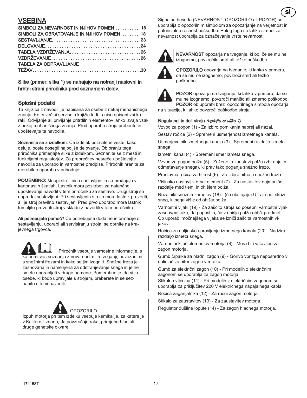 Slike (primer: slika 1) se nahajajo na notranji naslovni in hrbtni strani priroènika pred seznamom delov. Sploƒni podatki Ta knji∆ica z navodili je napisana za osebe z nekaj mehaniènega znanja. Kot v veèini servisnih knji∆ic tudi tu niso opisani vsi koraki. Odvijanje ali privijanje pritrdilnih elementov lahko izvaja vsak z nekaj mehaniènega znanja. Pred uporabo stroja preberite in upoƒtevajte ta navodila. Signalna beseda (NEVARNOST, OPOZORILO ali POZOR) se uporablja z opozorilnim simbolom za opozarjanje na verjetnost in potencialno resnost poƒkodbe. Poleg tega se lahko simbol za nevarnost uporablja za oznaèevanje vrste nevarnosti. NEVARNOST opozarja na tveganje, ki bo, èe se mu ne izognemo, povzroèilo smrt ali te∆ko poƒkodbo. OPOZORILO opozarja na tveganje, ki lahko v primeru, da se mu ne izognemo, povzroèi smrt ali te∆ko poƒkodbo. POZOR opozarja na tveganje, ki lahko v primeru, da se mu ne izognemo, povzroèi manjƒo ali zmerno poƒkodbo. POZOR ob uporabi brez opozorilnega simbola opozarja na situacijo, ki lahko povzroèi poƒkodbo stroja. Regulatorji in deli stroja (oglejte si sliko 1) Vzvod za pogon (1) - Za izbiro pomikanja naprej ali nazaj. Sestav roèice (2) - Spremeni usmerjenost izmetnega kanala. Seznanite se z izdelkom: Èe izdelek poznate in veste, kako deluje, boste dosegli najboljƒe delovanje. Ob branju tega priroènika primerjajte slike z izdelkom. Seznanite se z mesti in funkcijami regulatorjev. Za prepreèitev nesreèe upoƒtevajte navodila za uporabo in varnostne predpise. Priroènik hranite za morebitno uporabo v prihodnje. Usmerjevalnik izmetnega kanala (3) - Spremeni razdaljo izmeta snega. POMEMBNO: Mnogi stroji niso sestavljeni in se prodajajo v kartonastih ƒkatlah. Lastnik mora poskrbeti za natanèno upoƒtevanje navodil v tem priroèniku za sestavo. Drugi stroji so naprodaj sestavljeni. Pri sestavljenih strojih mora lastnik preveriti, ali je stroj pravilno sestavljen. Pred prvo uporabo mora lastnik temeljito preveriti stroj v skladu z navodili v tem priroèniku. Viƒinsko nastavljiv drsni element (7) - Za nastavitev najmanjƒe razdalje med tlemi in ohiƒjem pol∆a. Ali potrebujete pomoè? Èe potrebujete dodatne informacije o sestavljanju, uporabi ali servisiranju stroja, se obrnite na krajevnega trgovca. Priroènik vsebuje varnostne informacije, s katerimi vas seznanja z nevarnostmi in tveganji, povezanimi s sne∆nimi frezami in kako se jim izogniti. Sne∆na freza je zasnovana in namenjena za odstranjevanje snega in je ne smete uporabljati v druge namene. Pomembno je, da vi in osebe, ki bodo upravljale s strojem, preberete in se seznanite s temi navodili. Izmetni kanal (4) - Spremeni smer izmeta snega. Vzvod za pogon pol∆a (5) - Za∆ene in zaustavi pol∆a (zbiranje in odmetavanje snega), ki prav tako poganja sne∆no frezo. Prestavna roèica za hitrost (6) - Za izbiro hitrosti sne∆ne freze. Rezalniki sne∆nih zametov (18) - (èe obstajajo) Utirajo pot skozi sneg, ki sega viƒje od ohiƒja pol∆a. Varnostni vijaki (19) - Za zaƒèito stroja so posebni varnostni vijaki zasnovani tako, da popustijo, èe v ohiƒju pol∆a obtièi predmet. Ob uporabi moènejƒega vijaka se iznièi zaƒèita varnostnih vijakov. Roèica za daljinsko upravljanje izmetnega kanala (20) - Nadzira razdaljo izmeta snega. Varnostni kljuè elementov motorja (8) - Mora biti vstavljen za zagon motorja. Gumb èrpalke za hladni zagon (9) - Gorivo vbrizga neposredno v uplinjaè za hiter zagon v mrazu. Gumb za elektrièni zagon (10) - Pri modelih z elektriènim zagonom se uporablja za zagon motorja. Stikalna vtiènica (11) - Pri modelih z elektriènim zagonom se uporablja za prikljuèitev 220 V elektriènega napajalnega kabla. Roèica zaganjalnika (12) - Za roèni zagon motorja. Stikalo za zaustavitev (13) - Za zaustavitev motorja. OPOZORILO Izpuh motorja pri tem izdelku vsebuje kemikalije, za katere je v Kaliforniji znano, da povzroèajo raka, prirojene hibe ali druge genetske okvare.