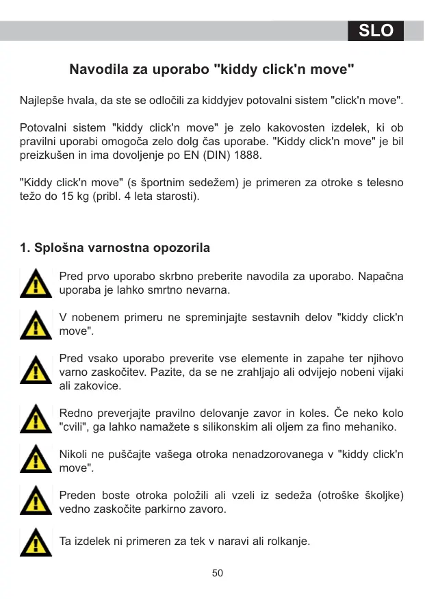 «kiddy click’n move» a été contrôlé et homologué pour répondre à la norme EN (DIN) 1888. Votre «kiddy click’n move» est conçu pour les enfants (4 ans env.) jusqu’à 15 kilos (avec siège poussette).