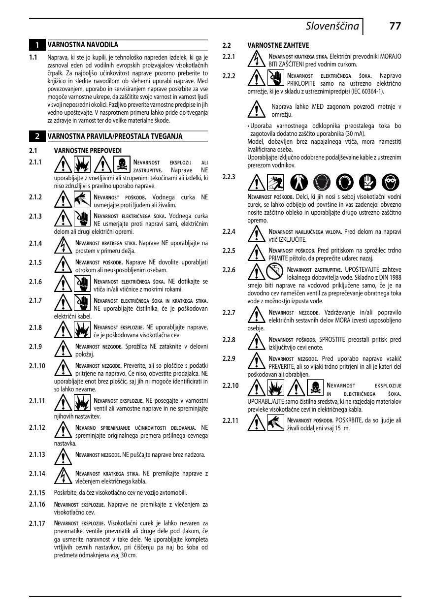 C6 Kit d'aspiration d'eau de la tête C7 Débouche C2 Buse rotative canalisation C3 Manche C8 Outil de nettoyage Vérifier qu’elles soient toujours présentes et lisibles ; dans le cas contraire, les remplacer en les appliquant dans la position d’origine. Icône E1 – Elle indique l’obligation de ne pas éliminer l’appareil comme déchet urbain ; il peut être redonné au distributeur au moment de l’achat d’un appareil neuf. Les parties électriques et électroniques de l’appareil ne doivent pas être réutilisées pour usages impropres car elles contiennent des substances dangereuses pour la santé. Icône E2 – Elle indique que l’appareil est conçu pour un usage professionnel, c’est-à-dire pour les personnes qui ont de l’expérience, une connaissance technique, normative, législative et qui sont en mesure d’exécuter les opérations nécessaires à l’utilisation et l’entretien de l’appareil. Icône E3 – Elle indique que l’appareil est conçu pour une usage non professionnel (domestique).