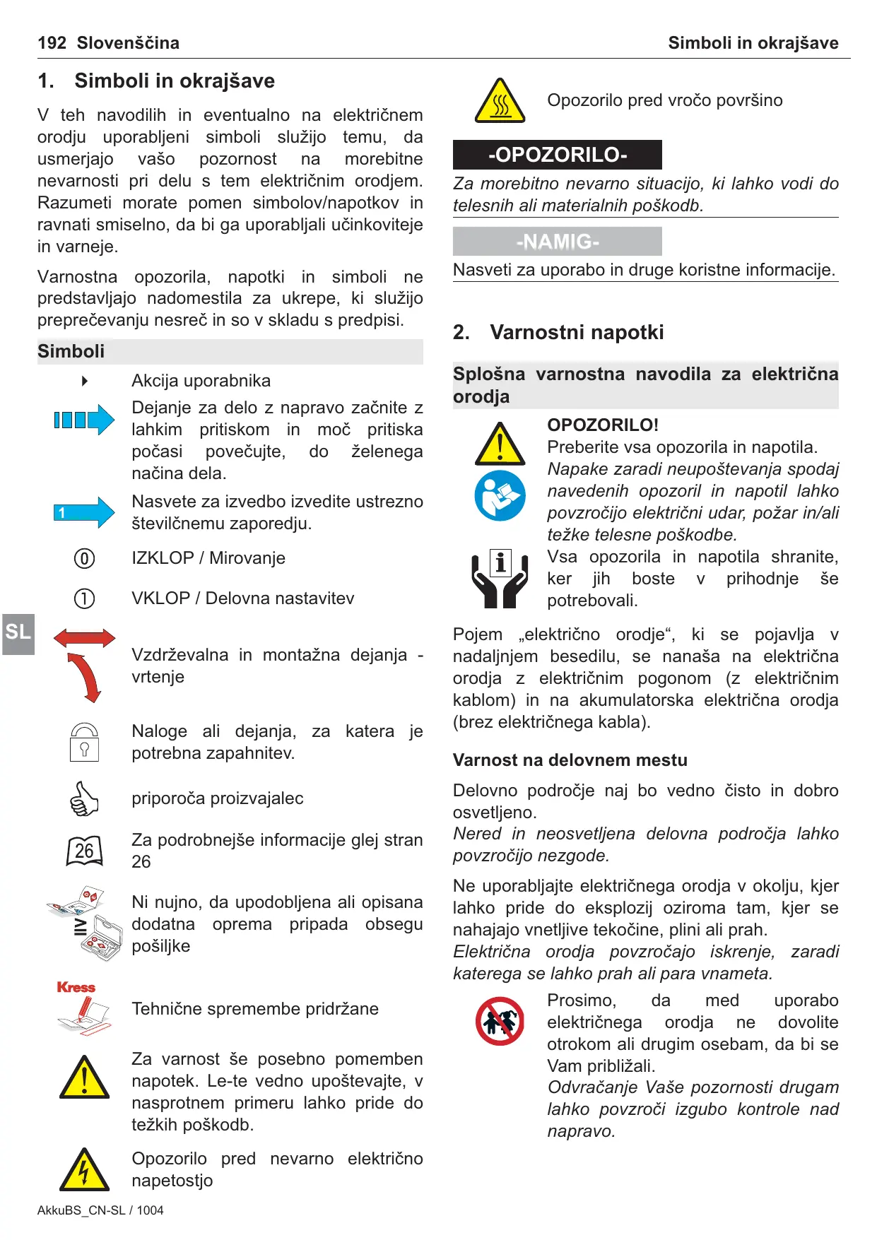 V teh navodilih in eventualno na elektrinem orodju uporabljeni simboli služijo temu, da usmerjajo vašo pozornost na morebitne nevarnosti pri delu s tem elektrinim orodjem. Razumeti morate pomen simbolov/napotkov in ravnati smiselno, da bi ga uporabljali uinkoviteje in varneje. Varnostna opozorila, napotki in simboli ne predstavljajo nadomestila za ukrepe, ki služijo prepreevanju nesre in so v skladu s predpisi. Opozorilo pred vroo površino -OPOZORILOZa morebitno nevarno situacijo, ki lahko vodi do telesnih ali materialnih poškodb. -NAMIGNasveti za uporabo in druge koristne informacije.