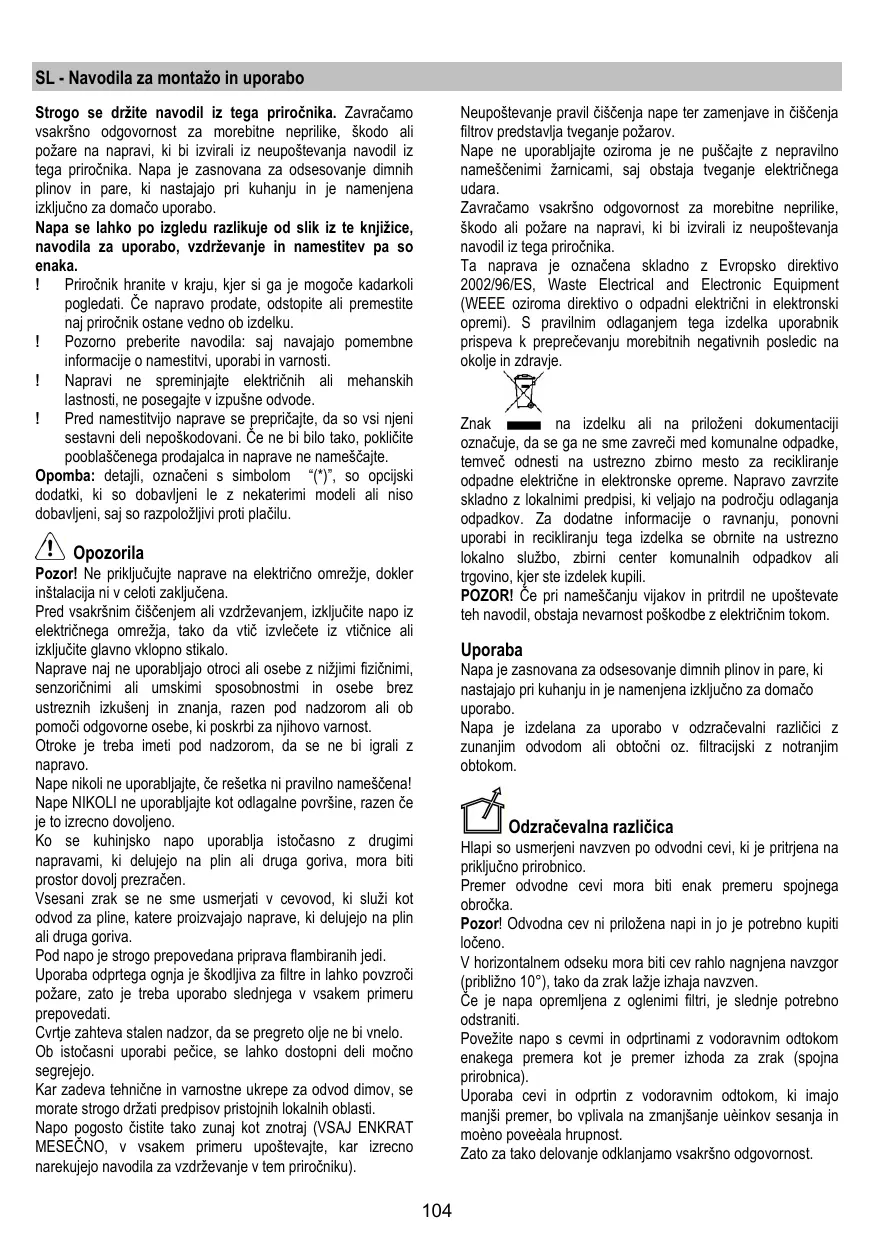 Neupoštevanje pravil čiščenja nape ter zamenjave in čiščenja filtrov predstavlja tveganje požarov. Nape ne uporabljajte oziroma je ne puščajte z nepravilno nameščenimi žarnicami, saj obstaja tveganje električnega udara. Zavračamo vsakršno odgovornost za morebitne neprilike, škodo ali požare na napravi, ki bi izvirali iz neupoštevanja navodil iz tega priročnika. Ta naprava je označena skladno z Evropsko direktivo 2002/96/ES, Waste Electrical and Electronic Equipment (WEEE oziroma direktivo o odpadni električni in elektronski opremi). S pravilnim odlaganjem tega izdelka uporabnik prispeva k preprečevanju morebitnih negativnih posledic na okolje in zdravje.