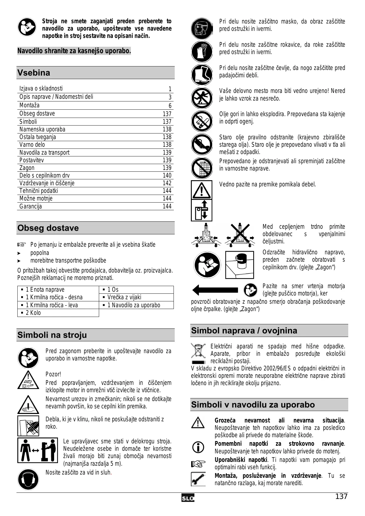Vaše delovno mesto mora biti vedno urejeno! Nered je lahko vzrok za nesrečo. Olje gori in lahko eksplodira. Prepovedana sta kajenje in odprti ogenj. Staro olje pravilno odstranite (krajevno zbirališče starega olja). Staro olje je prepovedano vlivati v tla ali mešati z odpadki. Prepovedano je odstranjevati ali spreminjati zaščitne in varnostne naprave. Vedno pazite na premike pomikala debel. Med cepljenjem trdno primite obdelovanec vpenjalnimi čeljustmi. Obseg dostave