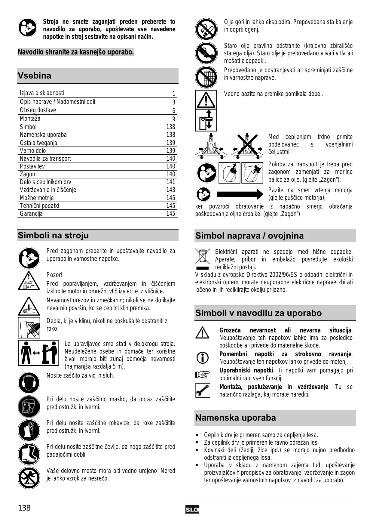 navodilo za uporabo, upostevate vse navedene (és Stroja ne smete zaganjati preden preberete to napotke in stroj sestavite na opisani naëin. Navodilo shranite za kasnej$o uporabo. Olje gori in lahko eksplodira. Prepovedana sta kajenje in odprti ogen). Staro olje pravino odstranite (krajevno zbiralisée starega olja). Staro olje je prepovedano vlivati v tla ali K meÿati z odpadki. Prepovedano je odstranjevati ali spreminjati zaSèitne in varnostne naprave. Vedno pazite na premike pomikala debel. Med cepljenjem trdno primite obdelovanec s vpenjalnimi Vsebina Izjava o skladnosti 1 Opis naprave / Nadomestni deli 3 Obseg dostave 6 Montaza 9 Simboli 138 Namenska uporaba 138 Ostala tveganja 139 Varno delo 139 Navodila za transport 140 Postavitev 140 Zagon 140 Delo s cepilnikom drv 141 Vzdrzevanje in &iséenje 143 Moëne motnje 145 Tehniëni podatki 145 Garancija 145 celjustmi. Pokrov za transport je treba pred zagonom zamenjati za merino palico za olje. (glejte ,Zagon“); Pazite na smer vrtenja motorja [és un d (glejte pusëico motorja), ker povzroël obratovanje Zz napaëno smerjo obraëanja poSkodovanje oljne érpalke. (glejte ,Zagon) Simboli na stroju Simbol naprava / ovojnina Pred zagonom preberite in upostevajte navodilo za uporabo in varnostne napotke. Pozor! Pred popravijanjem, vzdrevanjem in ëSéenjem izklopite motor in omrezni vtié izvlecite iz vtiénice. Nevarnost urezov in zmeëkanin; nikoli se ne dotikajte nevarnih povréin, ko se cepilni klin premika. Debla, ki je v klinu, nikoli ne poskuSaite odstraniti z roko. NeudeleZene osebe in domaëe ter korisine Zivali morajo biti zunaj obmoëja nevarnosti {najmanj$a razdalja 5 m). Nosite zasëito za vid in sluh. fi Le upravljavec sme stati v delokrogu stroja. Pri delu nosite zaS&tno masko, da obraz zaSëitite pred ostruzki in ivermi. Pri delu nosite zaSëitne rokavice, da roke zaÿäitite pred ostruzki in ivermi. C0 = TO Pri delu nosite zaÿéitne éevije, da nogo zaÿüitite pred padajoëimi debli. Vaÿe delovno mesto mora biti vedno urejeno! Nered je lahko vzrok za nesreéo. Elektriéni aparati ne spadajo med hiëne odpadke. Aparate, pribor in embalao posredujte ekoloëki == reciklazni postajl. V skladu z evropsko Direktivo 2002/96/ES o odpadhni elektriëni in elektronski opremi morate neuporabne elektriëne naprave zbirati loëeno in jih reciklirajte okolju prijazno. Simboli v navodilu za uporabo Grozeëa nevarnost ali nevarna situacija. Neupostevanje teh napotkov lahko ima za posledico poSkodbe ali privede do materialne $kode. Pomembni napotki za strokovno ravnanje. Neupostevanje teh napotkov lahko privede do moten). Uporabniëki napotki. Ti napotki vam pomagajo pri optimalni rabi vseh funkci). Montaza, posluZevanje in vzdrzevanje. Tu se natanëno razlaga, kaj morate narediti. NSe à Namenska uporaba Cepilnik drv je primeren samo za cepljenje lesa. Za cepilnik drv je primeren le ravno odrezan les. Kovinski deli (Zeblj, Zice ipd.) se morajo nujno predhodno odstraniti iz cepljenega lesa. Uporaba v skladu z namenom zajema tudi upostevanje proizvajaléevih predpisov za obratovanje, vzdréevanje in zagon ter upostevanje varnostnih napotkov iz navodil za uporabo.