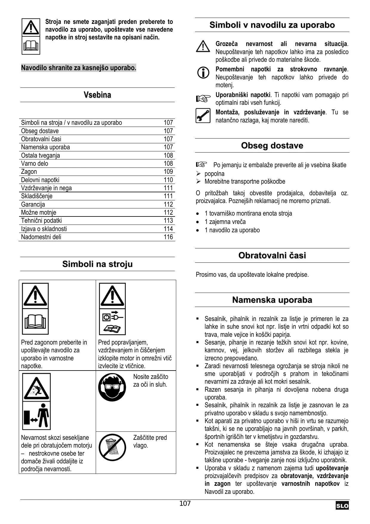 - 1 navodilo za uporabo Obratovalni časi Simboli na stroju Prosimo vas, da upoštevate lokalne predpise. Namenska uporaba Pred zagonom preberite in upoštevajte navodilo za uporabo in varnostne napotke. Sesalnik, pihalnik in rezalnik za listje je primeren le za lahke in suhe snovi kot npr. listje in vrtni odpadki kot so trava, male vejice in koščki papirja. Sesanje, pihanje in rezanje težkih snovi kot npr. kovine, kamnov, vej, jelkovih storžev ali razbitega stekla je izrecno prepovedano. Zaradi nevarnosti telesnega ogrožanja se stroja nikoli ne sme uporabljati v področjih s prahom in tekočinami nevarnimi za zdravje ali kot mokri sesalnik. Razen sesanja in pihanja ni dovoljena nobena druga uporaba. Sesalnik, pihalnik in rezalnik za listje je zasnovan le za privatno uporabo v skladu s svojo namembnostjo. Kot aparati za privatno uporabo v hiši in vrtu se razumejo takšni, ki se ne uporabljajo na javnih površinah, v parkih, športnih igriščih ter v kmetijstvu in gozdarstvu. Kot nenamenska se šteje vsaka drugačna upraba. Proizvajalec ne prevzema jamstva za škode, ki izhajajo iz takšne uporabe - tveganje zanje nosi izključno uporabnik. Uporaba v skladu z namenom zajema tudi upoštevanje proizvajalčevih predpisov za obratovanje, vzdrževanje in zagon ter upoštevanje varnostnih napotkov iz Navodil za uporabo. Pred popravljanjem, vzdrževanjem in čiščenjem izklopite motor in omrežni vtič izvlecite iz vtičnice. Nosite zaščito za oči in sluh. Nevarnost skozi sesekljane dele pri obratujočem motorju – nestrokovne osebe ter domače živali oddaljite iz področja nevarnosti. Zaščitite pred vlago.
