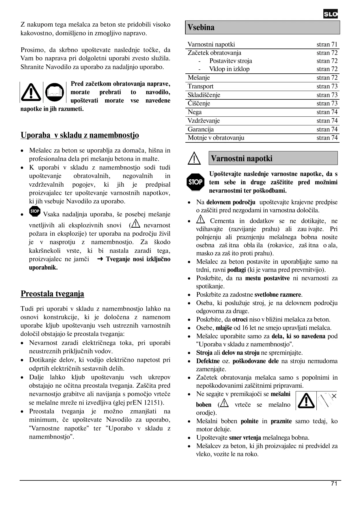 Z nakupom tega me$alca za beton ste pridobili visoko kakovostno, domiSljeno in zmogljivo napravo. Prosimo, da skrbno upoëtevate naslednje toëke, da Vam bo naprava pri dolgoletni uporabi zvesto sluzila. Shranite Navodilo za uporabo za nadaljnjo uporabo. | A morate prebrati to navodilo, upoëtevati morate vse navedene napotke in jih razumeti. Pred zatetkom obratovanja naprave, Uporaba v skladu z namembnostjo e _Meÿalec za beton se uporablja za domaëa, hiëna in profesionalna dela pri meSanju betona in malte. + K uporabi v skladu z namembnostjo sodi tudi upoëtevanje obratovalnih, negovalnih in vzdrievalnih pogojev, ki jih je predpisal proizvajalec ter upoëtevanje varnostnih napotkov, ki jih vsebuje Navodilo za uporabo. Q © Vsaka nadaljnja uporaba, ëe posebej meÿanje vnetljivih ali eksplozivnih snovi À nevarnost poÿara in eksplozije) ter uporaba na podroëju Zivil je v nasprotju z namembnostjo. Za Skodo kakrënekoli vrste, ki bi nastala zaradi tega, proizvajalec ne jamëi —> Tveganje nosi izkljuëno uporabnik. Preostala tveganja Tudi pri uporabi v skladu z namembnostjo lahko na osnovi konstrukcije, ki je doloëena z namenom uporabe kljub upoëtevanju vseh ustreznih varnostnih doloëil obstajajo $e preostala tveganja: e Nevarnost zaradi elektriénega toka, pri uporabi neustreznih prikljuënih vodov. e Dotikanje delov, ki vodijo elektriëno napetost pri odprtih elektriénih sestavnih delih. e Dalje lahko Kkljub upoëtevanju vseh ukrepov obstajajo ne oëitna preostala tveganja. Zaëëita pred nevarnostjo grabitve ali navijanja s pomoéjo vrteée se meÿalne mre?e ni izvedljiva (glej prEN 12151). e Preostala tveganja je moëno Zzmanjsati na minimum, êe upoëtevate Navodilo za uporabo, "Varnostne napotke" ter “Uporabo v skladu z namembnostjo". Vsebina Varnostni napotki stran 71 Zaëetek obratovanja stran 72 - Postavitev stroja stran 72 - Vklopinizklop stran 72 Meÿanje stran 72 Transport stran 73 SkladiStenje stran 73 Cistenje stran 73 Nega stran 74 Vzdrzevanje stran 74 Garancija stran 74 Motnje v obratovanju stran 74 VAN Varnostni napotki tem sebe in druge zaëtitite pred moZnimi ro) Upoëtevajte naslednje varnostne napotke, da s = nevarnostmi ter poëkodbami. ° Na delovnem podroëju upoëtevajte krajevne predpise o zaëtiti pred nezgodami in varnostna doloëila. . À Cementa in dodatkov se ne dotikajte, ne vdihavajte (razvijanje prahu) ali zauivajte. Pri polnjenju ali praznjenju meSalnega bobna nosite osebna Zaÿitna oblaila (rokavice, za$itna oala, masko za zaë ito proti prahu). e Meïalec za beton postavite in uporabljajte samo na trdni, ravni podlagi (ki je varna pred prevrnitvijo). e Poskrbite, da na mestu postavitve ni nevarnosti za spotikanje. + Poskrbite za zadostne svetlobne razmere. e Oseba, ki posluZuje stroj, je na delovnem podroëju odgovorna za druge. + _ Poskrbite, da otroci niso v bliZini meëalca za beton. *_ Oscbe, mlajëe od 16 let ne smejo upravljati meÿalca. e _ Meïalec uporabite samo za dela, ki so navedena pod "Uporaba v skladu z namembnostjo". °__Stroja ali delov na stroju ne spreminjajte. ° _ Defektne oz. poëkodovane dele na stroju nemudoma zamenjajte. e Zaïetek obratovanja meëalca samo s popolnimi in nepoëkodovanimi zaSëitnimi pripravami. °__ Ne segajte v premikajoëi se meÿalni boben AN viteée se meÿalno orodje). e Meïalni boben polnite in praznite samo tedaj, ko motor deluje. °__ Upoëtevajte smer vrtenja meÿalnega bobna. e _ Meïalcev za beton, ki jih proizvajalec ni predvidel za vleko, vozite le na roko.