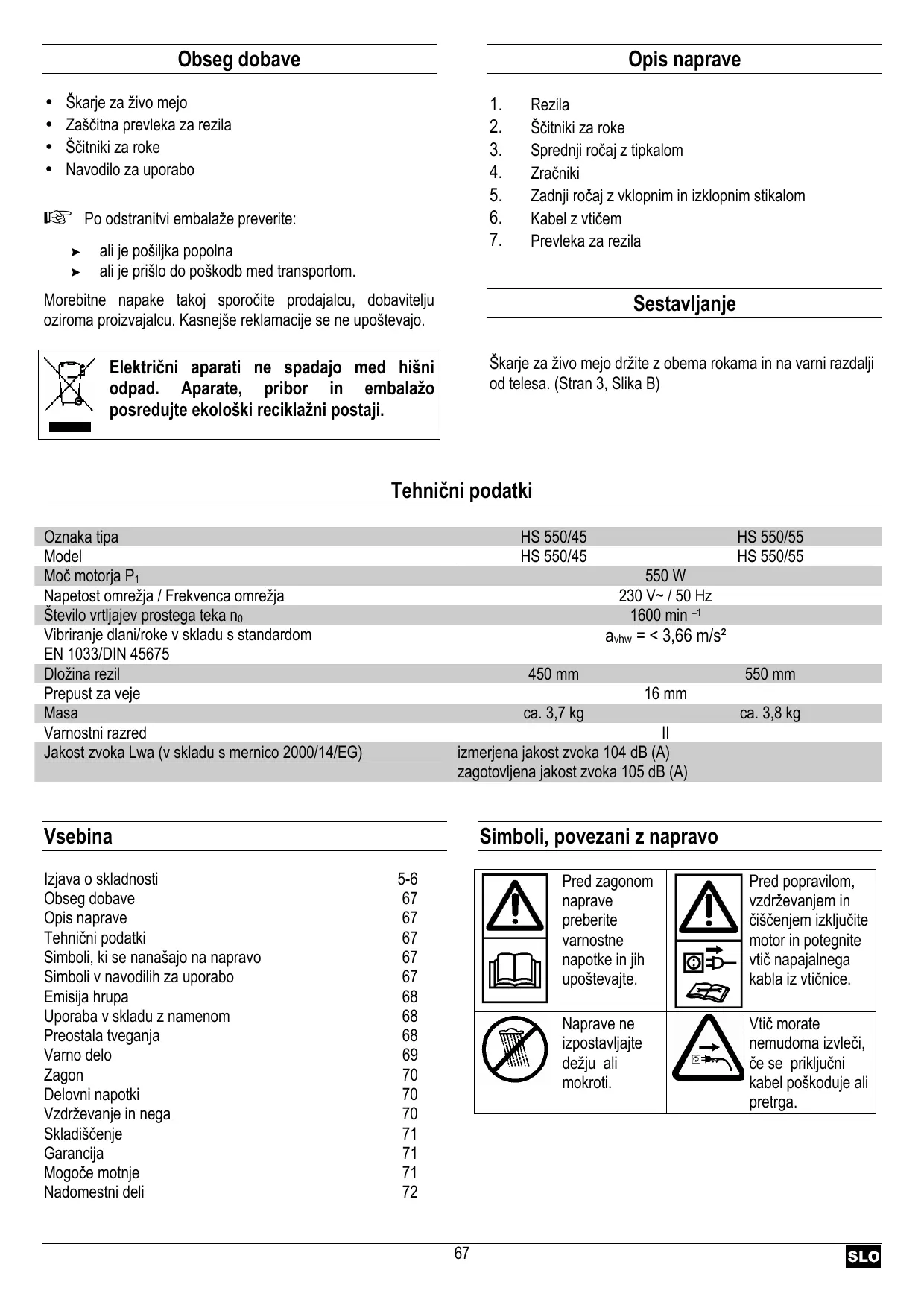 ali je pošiljka popolna ali je prišlo do poškodb med transportom. Rezila Ščitniki za roke Sprednji ročaj z tipkalom Zračniki Zadnji ročaj z vklopnim in izklopnim stikalom Kabel z vtičem Prevleka za rezila Morebitne napake takoj sporočite prodajalcu, dobavitelju oziroma proizvajalcu. Kasnejše reklamacije se ne upoštevajo. Sestavljanje Škarje za živo mejo držite z obema rokama in na varni razdalji od telesa. (Stran 3, Slika B) Električni aparati ne spadajo med hišni odpad. Aparate, pribor in embalažo posredujte ekološki reciklažni postaji. Tehnični podatki Oznaka tipa Model Moč motorja P1 Napetost omrežja / Frekvenca omrežja Število vrtljajev prostega teka n0 Vibriranje dlani/roke v skladu s standardom EN 1033/DIN 45675 Dložina rezil Prepust za veje Masa Varnostni razred Jakost zvoka Lwa (v skladu s mernico 2000/14/EG) HS 550/45 HS 550/45 550 W 230 V~ / 50 Hz 1600 min –1 avhw = < 3,66 m/s² 450 mm 550 mm 16 mm ca. 3,7 kg ca. 3,8 kg