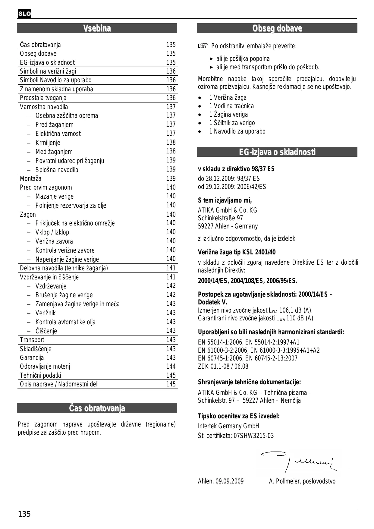 EG-izjava o skladnosti v skladu z direktivo 98/37 ES do 28.12.2009: 98/37 ES od 29.12.2009: 2006/42/ES S tem izjavljamo mi, ATIKA GmbH & Co. KG Schinkelstraße 97 59227 Ahlen - Germany z izključno odgovornostjo, da je izdelek Verižna žaga tip KSL 2401/40 v skladu z določili zgoraj navedene Direktive ES ter z določili naslednjih Direktiv: 2000/14/ES, 2004/108/ES, 2006/95/ES. Postopek za ugotavljanje skladnosti: 2000/14/ES – Dodatek V. Izmerjen nivo zvočne jakost LWA 106,1 dB (A). Garantirani nivo zvočne jakosti LWA 110 dB (A). Uporabljeni so bili naslednjih harmonizirani standardi: EN 55014-1:2006, EN 55014-2:1997+A1 EN 61000-3-2:2006, EN 61000-3-3:1995+A1+A2 EN 60745-1:2006, EN 60745-2-13:2007 ZEK 01.1-08 / 06.08 Shranjevanje tehnične dokumentacije: ATIKA GmbH & Co. KG – Tehnična pisarna – Schinkelstr. 97 – 59227 Ahlen – Nemčija Tipsko ocenitev za ES izvedel: Intertek Germany GmbH Št. certifikata: 07SHW3215-03