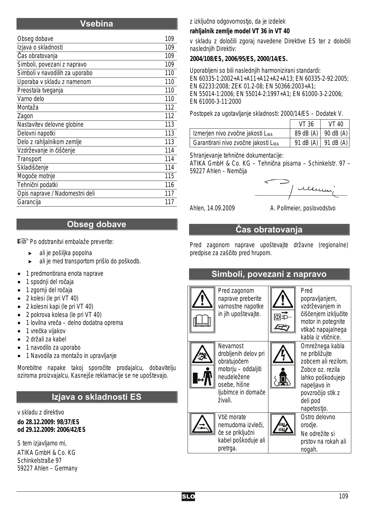 z izključno odgovornostjo, da je izdelek rahljalnik zemlje model VT 36 in VT 40 v skladu z določili zgoraj navedene Direktive ES ter z določili naslednjih Direktiv: 2004/108/ES, 2006/95/ES, 2000/14/ES. Uporabljeni so bili naslednjih harmonizirani standardi: EN 60335-1:2002+A1+A11+A12+A2+A13; EN 60335-2-92:2005; EN 62233:2008; ZEK 01.2-08; EN 50366:2003+A1; EN 55014-1:2006; EN 55014-2:1997+A1; EN 61000-3-2:2006; EN 61000-3-11:2000 Postopek za ugotavljanje skladnosti: 2000/14/ES – Dodatek V.