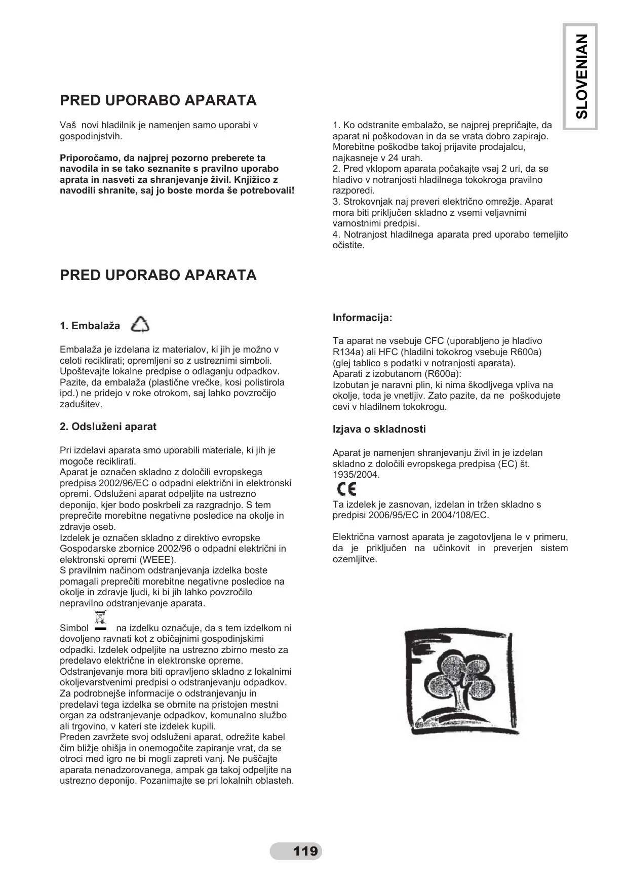 OPOZORILO: Odsluženi aparat odpeljite na ustrezno deponijo skladno z dolocili predpisa W.E.E.E. Vaš aparat vsebuje hladivo R600a ter vnetljiv plin v izolacijski peni.