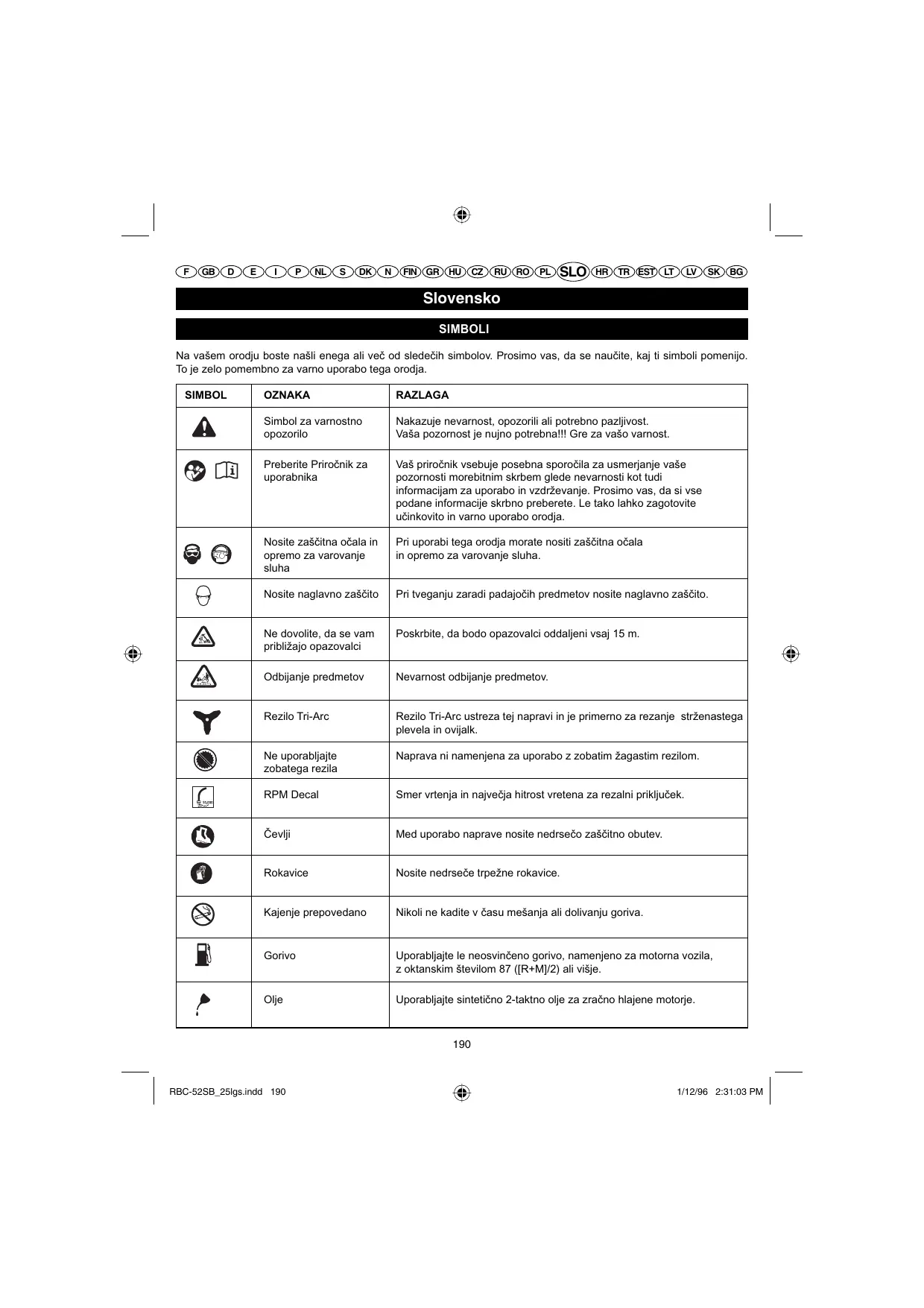 Slovensko SIMBOLI Na vašem orodju boste našli enega ali več od sledečih simbolov. Prosimo vas, da se naučite, kaj ti simboli pomenijo. To je zelo pomembno za varno uporabo tega orodja. SIMBOL OZNAKA RAZLAGA Mešanje goriva in olja Temeljito zmešajte mešanico goriva, tudi pred vsakim dolivanjem. Močno pritisnite in spustite glavni del 5 krat. Ustreza vsem predpisanim standardom v državi članici EU, kjer je bil kupljen izdelek. Zahvaljujemo se vam za nakup kosilnice z nitko znamke Ryobi.