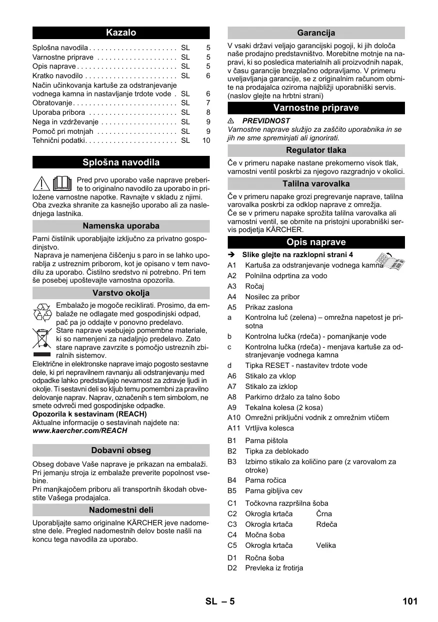 Ilustraciones, véase la contraportada 4 A1 Cartucho de descalcificación A2 Orificio de llenado para agua A3 Asa de transporte A4 Soporte para accesorios A5 Indicación en pantalla a Piloto de control (verde) de tensión de red disponible b Piloto de control (rojo) - Falta de agua c Piloto de control (rojo) - cambiar el cartucho de descalcificación d Tecla de RESET - configurar la dureza del agua A6 Interruptor - ON A7 Interruptor - OFF A8 Soporte de estacionamiento para la boquilla de suelos A9 Ruedas (2 unidades) A10 Cable de conexión a red y enchufe de red A11 Rodillo de dirección B1 Manguera de vapor
