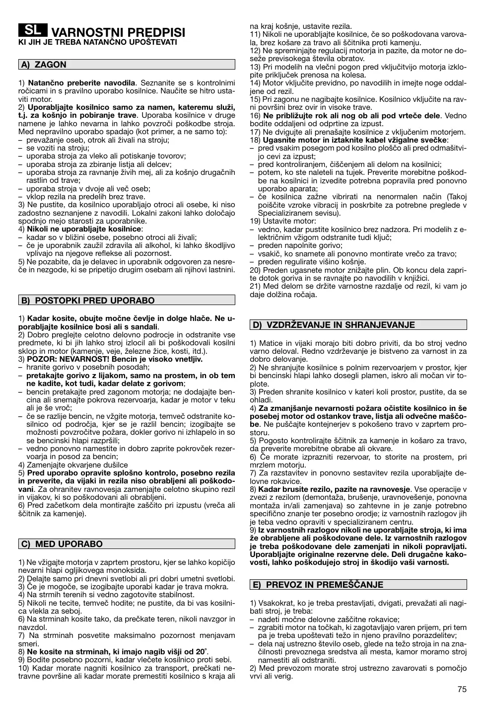 SL VARNOSTNI PREDPISI KI JIH JE TREBA NATANČNO UPOŠTEVATI A) ZAGON 1) Natančno preberite navodila. Seznanite se s kontrolnimi ročicami in s pravilno uporabo kosilnice. Naučite se hitro ustaviti motor. 2) Uporabljajte kosilnico samo za namen, kateremu služi, t.j. za košnjo in pobiranje trave. Uporaba kosilnice v druge namene je lahko nevarna in lahko povzroči poškodbe stroja. Med nepravilno uporabo spadajo (kot primer, a ne samo to): – prevažanje oseb, otrok ali živali na stroju; – se voziti na stroju; – uporaba stroja za vleko ali potiskanje tovorov; – uporaba stroja za zbiranje listja ali delcev; – uporaba stroja za ravnanje živih mej, ali za košnjo drugačnih rastlin od trave; – uporaba stroja v dvoje ali več oseb; – vklop rezila na predelih brez trave. 3) Ne pustite, da kosilnico uporabljajo otroci ali osebe, ki niso zadostno seznanjene z navodili. Lokalni zakoni lahko določajo spodnjo mejo starosti za uporabnike. 4) Nikoli ne uporabljajte kosilnice: – kadar so v bližini osebe, posebno otroci ali živali; – če je uporabnik zaužil zdravila ali alkohol, ki lahko škodljivo vplivajo na njegove reflekse ali pozornost. 5) Ne pozabite, da je delavec in uporabnik odgovoren za nesreče in nezgode, ki se pripetijo drugim osebam ali njihovi lastnini.