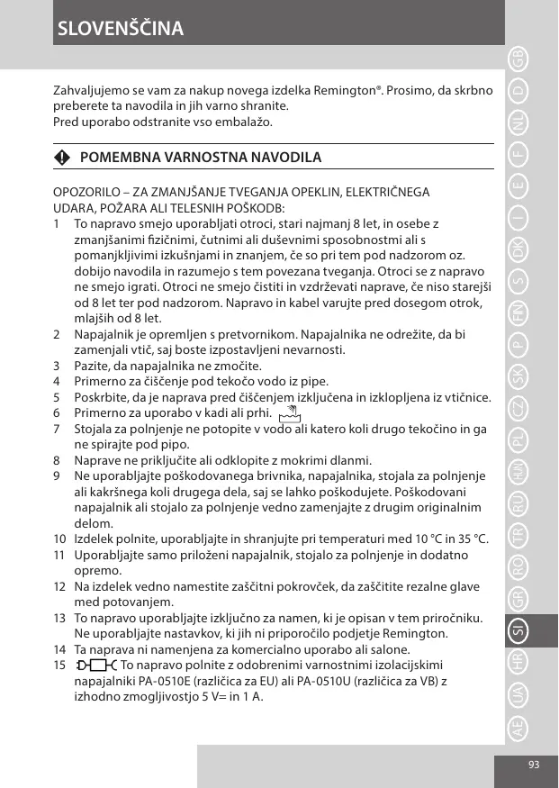 OPOZORILO – ZA ZMANJŠANJE TVEGANJA OPEKLIN, ELEKTRIČNEGA UDARA, POŽARA ALI TELESNIH POŠKODB: 1 To napravo smejo uporabljati otroci, stari najmanj 8 let, in osebe z zmanjšanimi fizičnimi, čutnimi ali duševnimi sposobnostmi ali s pomanjkljivimi izkušnjami in znanjem, če so pri tem pod nadzorom oz. dobijo navodila in razumejo s tem povezana tveganja. Otroci se z napravo ne smejo igrati. Otroci ne smejo čistiti in vzdrževati naprave, če niso starejši od 8 let ter pod nadzorom. Napravo in kabel varujte pred dosegom otrok, mlajših od 8 let. 2 Napajalnik je opremljen s pretvornikom. Napajalnika ne odrežite, da bi zamenjali vtič, saj boste izpostavljeni nevarnosti. 3 Pazite, da napajalnika ne zmočite. 4 Primerno za čiščenje pod tekočo vodo iz pipe. 5 Poskrbite, da je naprava pred čiščenjem izključena in izklopljena iz vtičnice. 6 Primerno za uporabo v kadi ali prhi. 7 Stojala za polnjenje ne potopite v vodo ali katero koli drugo tekočino in ga ne spirajte pod pipo. 8 Naprave ne priključite ali odklopite z mokrimi dlanmi. 9 Ne uporabljajte poškodovanega brivnika, napajalnika, stojala za polnjenje ali kakršnega koli drugega dela, saj se lahko poškodujete. Poškodovani napajalnik ali stojalo za polnjenje vedno zamenjajte z drugim originalnim delom. 10 Izdelek polnite, uporabljajte in shranjujte pri temperaturi med 10 °C in 35 °C. 11 Uporabljajte samo priloženi napajalnik, stojalo za polnjenje in dodatno opremo. 12 Na izdelek vedno namestite zaščitni pokrovček, da zaščitite rezalne glave med potovanjem. 13 To napravo uporabljajte izključno za namen, ki je opisan v tem priročniku. Ne uporabljajte nastavkov, ki jih ni priporočilo podjetje Remington. 14 Ta naprava ni namenjena za komercialno uporabo ali salone. To napravo polnite z odobrenimi varnostnimi izolacijskimi napajalniki PA-0510E (različica za EU) ali PA-0510U (različica za VB) z izhodno zmogljivostjo 5 V= in 1 A.