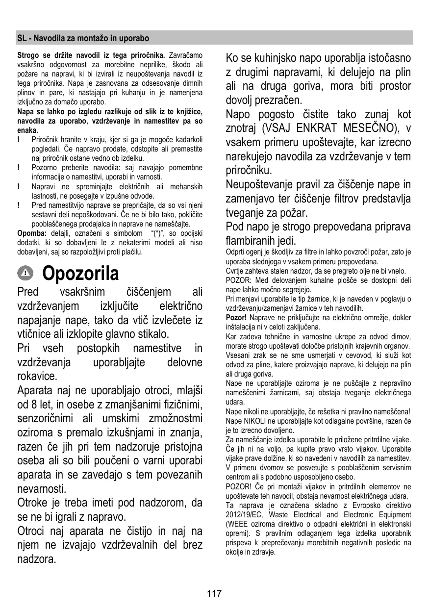 Obtočna različica Znak na izdelku ali na priloženi dokumentaciji označuje, da se ga ne sme zavreči med komunalne odpadke, temveč odnesti na ustrezno zbirno mesto za recikliranje odpadne električne in elektronske opreme. Napravo zavrzite skladno z lokalnimi predpisi, ki veljajo na področju odlaganja odpadkov. Za dodatne informacije o ravnanju, ponovni uporabi in recikliranju tega izdelka se obrnite na ustrezno lokalno službo, zbirni center komunalnih odpadkov ali trgovino, kjer ste izdelek kupili. Iz vsesanega zraka so pred ponovnim vnosom v prostor odstranjeni maščoba in neprijetne vonjave. Pri uporabi nape v tej izvedbi je potrebno namestiti dodatni filter na osnovi aktivnega oglja. Inštalacija Minimalna razdalja med podporno površino posod na kuhalni površini in spodnjim delom nape za kuhinjske prostore ne sme biti manjša od 45cm pri električnih štedilnikih in 50cm pri plinskih ali mešanih štedilnikih. Če je v navodilih za instalacijo plinskega kuhalnika napisana večja razdalja, jo je treba tudi upoštevati. Aparat je bil zasnovan, testiran in izdelan v skladu z: