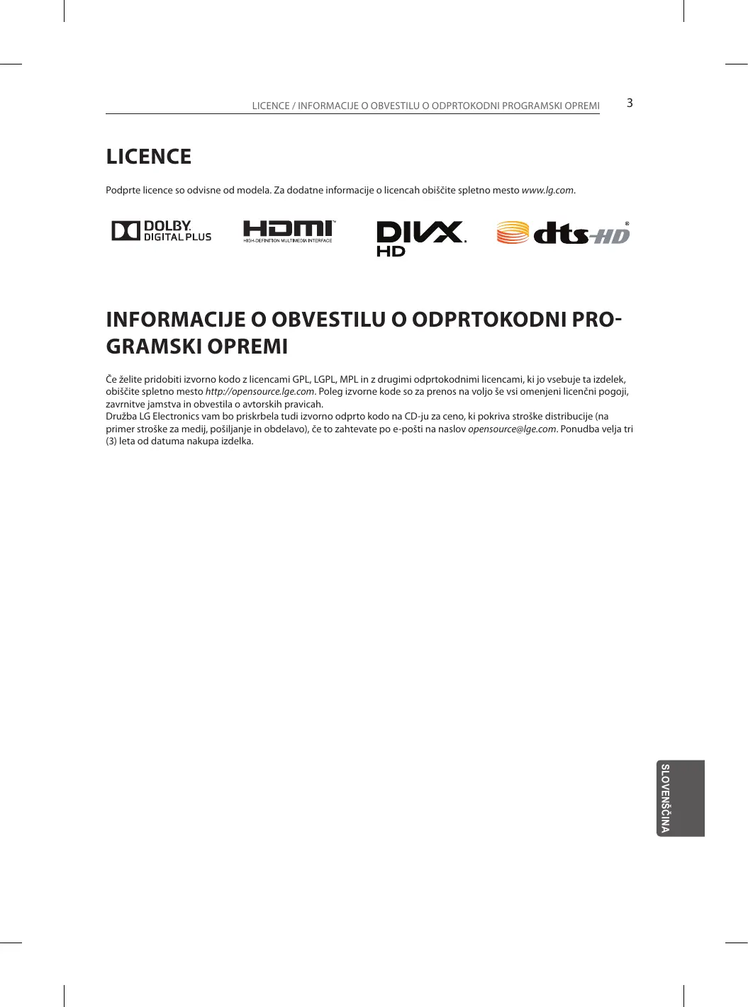 LICENCE Podprte licence so odvisne od modela. Za dodatne informacije o licencah obiščite spletno mesto www.lg.com. INFORMACIJE O OBVESTILU O ODPRTOKODNI PROGRAMSKI OPREMI Če želite pridobiti izvorno kodo z licencami GPL, LGPL, MPL in z drugimi odprtokodnimi licencami, ki jo vsebuje ta izdelek, obiščite spletno mesto http://opensource.lge.com. Poleg izvorne kode so za prenos na voljo še vsi omenjeni licenčni pogoji, zavrnitve jamstva in obvestila o avtorskih pravicah. Družba LG Electronics vam bo priskrbela tudi izvorno odprto kodo na CD-ju za ceno, ki pokriva stroške distribucije (na primer stroške za medij, pošiljanje in obdelavo), če to zahtevate po e-pošti na naslov opensource@lge.com. Ponudba velja tri (3) leta od datuma nakupa izdelka. SLOVENŠČINA