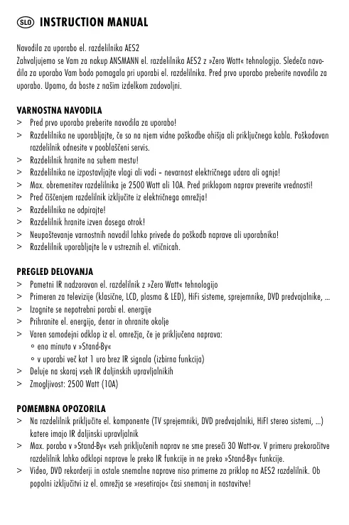 Aby ste zabezpečili bezproblémovú prevádzku IR zásuvky, dbajte o to, aby neboli elektrické kontakty zanesené alebo zaprášené. Pred čistením odpojte zariadenie od elektrickej siete a používajte iba suchú handričku! TECHNICKÉ ÚDAJE Vstup: 230V AC / 50Hz Záťaž: max. 2500W / 10A Spotreba: 0W v stand-by režime (po odpojení od siete) VYHLÁSENIE Informácie v tomto návode môžu byť zmenené bez predošlého upozornenia. ANSMANN nepreberá zodpovednosť za priame, nepriame, náhodné alebo iné škody, ktoré vzniknú používaním tohto produktu a informácií obsiahnutých v tomto návode. ZÁRUKA Na tento produkt sa vzťahuje záruka 3 roky. Táto záruka sa nevzťahuje na škody spôsobené nedodržaním návodu na použitie alebo mechanické poškodenie spôsobené neopatrným zaobchádzaním. Technické zmeny a omyly vyhradené. Za tlačové chyby nepreberáme zodpovednosť. 07/2009 SLO Instruction manual Navodila za uporabo el. razdelilnika AES2 Zahvaljujemo se Vam za nakup ANSMANN el. razdelilnika AES2 z »Zero Watt« tehnologijo. Sledeča navodila za uporabo Vam bodo pomagala pri uporabi el. razdelilnika. Pred prvo uporabo preberite navodila za uporabo. Upamo, da boste z našim izdelkom zadovoljni. Varnostna navodila > Pred prvo uporabo preberite navodila za uporabo! > Razdelilnika ne uporabljajte, če so na njem vidne poškodbe ohišja ali priključnega kabla. Poškodovan razdelilnik odnesite v pooblaščeni servis. > Razdelilnik hranite na suhem mestu! > Razdelilnika ne izpostavljajte vlagi ali vodi – nevarnost električnega udara ali ognja! > Max. obremenitev razdelilnika je 2500 Watt ali 10A. Pred priklopom naprav preverite vrednosti! > Pred čiščenjem razdelilnik izključite iz električnega omrežja! > Razdelilnika ne odpirajte! > Razdelilnik hranite izven dosega otrok! > Neupoštevanje varnostnih navodil lahko privede do poškodb naprave ali uporabnika! > Razdelilnik uporabljajte le v ustreznih el. vtičnicah. Pregled delovanja > Pametni IR nadzorovan el. razdelilnik z »Zero Watt« tehnologijo > Primeren za televizije (klasične, LCD, plasma & LED), HiFi sisteme, sprejemnike, DVD predvajalnike, … > Izognite se nepotrebni porabi el. energije > Prihranite el. energijo, denar in ohranite okolje > Varen samodejni odklop iz el. omrežja, če je priključena naprava: ∘ eno minuto v »Stand-By« ∘ v uporabi več kot 1 uro brez IR signala (izbirna funkcija) > Deluje na skoraj vseh IR daljinskih upravljalnikih > Zmogljivost: 2500 Watt (10A) Pomembna opozorila > Na razdelilnik priključite el. komponente (TV sprejemniki, DVD predvajalniki, HiFI stereo sistemi, …) katere imajo IR daljinski upravljalnik > Max. poraba v »Stand-By« vseh priključenih naprav ne sme preseči 30 Watt-ov. V primeru prekoračitve razdelilnik lahko odklopi naprave le preko IR funkcije in ne preko »Stand-By« funkcije. > Video, DVD rekorderji in ostale snemalne naprave niso primerne za priklop na AES2 razdelilnik. Ob popolni izključitvi iz el. omrežja se »resetirajo« časi snemanj in nastavitve! Delovanje
