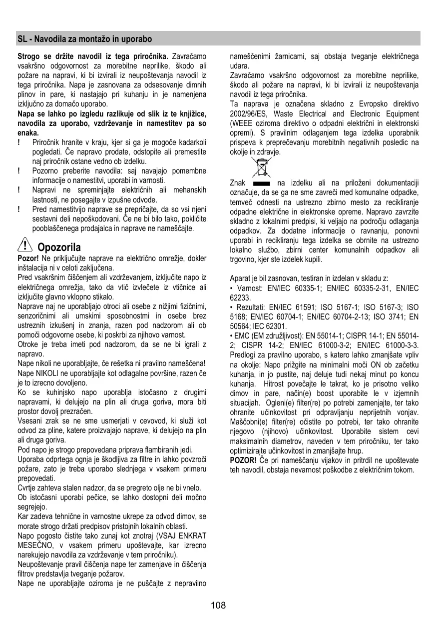 SL - Navodila za montažo in uporabo nameščenimi žarnicami, saj obstaja tveganje električnega udara. Zavračamo vsakršno odgovornost za morebitne neprilike, škodo ali požare na napravi, ki bi izvirali iz neupoštevanja navodil iz tega priročnika. Ta naprava je označena skladno z Evropsko direktivo 2002/96/ES, Waste Electrical and Electronic Equipment (WEEE oziroma direktivo o odpadni električni in elektronski opremi). S pravilnim odlaganjem tega izdelka uporabnik prispeva k preprečevanju morebitnih negativnih posledic na okolje in zdravje. Strogo se držite navodil iz tega priročnika. Zavračamo vsakršno odgovornost za morebitne neprilike, škodo ali požare na napravi, ki bi izvirali iz neupoštevanja navodil iz tega priročnika. Napa je zasnovana za odsesovanje dimnih plinov in pare, ki nastajajo pri kuhanju in je namenjena izključno za domačo uporabo. Napa se lahko po izgledu razlikuje od slik iz te knjižice, navodila za uporabo, vzdrževanje in namestitev pa so enaka. Priročnik hranite v kraju, kjer si ga je mogoče kadarkoli pogledati. Če napravo prodate, odstopite ali premestite naj priročnik ostane vedno ob izdelku. Pozorno preberite navodila: saj navajajo pomembne informacije o namestitvi, uporabi in varnosti. Napravi ne spreminjajte električnih ali mehanskih lastnosti, ne posegajte v izpušne odvode. Pred namestitvijo naprave se prepričajte, da so vsi njeni sestavni deli nepoškodovani. Če ne bi bilo tako, pokličite pooblaščenega prodajalca in naprave ne nameščajte. Znak na izdelku ali na priloženi dokumentaciji označuje, da se ga ne sme zavreči med komunalne odpadke, temveč odnesti na ustrezno zbirno mesto za recikliranje odpadne električne in elektronske opreme. Napravo zavrzite skladno z lokalnimi predpisi, ki veljajo na področju odlaganja odpadkov. Za dodatne informacije o ravnanju, ponovni uporabi in recikliranju tega izdelka se obrnite na ustrezno lokalno službo, zbirni center komunalnih odpadkov ali trgovino, kjer ste izdelek kupili. Opozorila Pozor! Ne priključujte naprave na električno omrežje, dokler inštalacija ni v celoti zaključena. Pred vsakršnim čiščenjem ali vzdrževanjem, izključite napo iz električnega omrežja, tako da vtič izvlečete iz vtičnice ali izključite glavno vklopno stikalo. Naprave naj ne uporabljajo otroci ali osebe z nižjimi fizičnimi, senzoričnimi ali umskimi sposobnostmi in osebe brez ustreznih izkušenj in znanja, razen pod nadzorom ali ob pomoči odgovorne osebe, ki poskrbi za njihovo varnost. Otroke je treba imeti pod nadzorom, da se ne bi igrali z napravo. Nape nikoli ne uporabljajte, če rešetka ni pravilno nameščena! Nape NIKOLI ne uporabljajte kot odlagalne površine, razen če je to izrecno dovoljeno. Ko se kuhinjsko napo uporablja istočasno z drugimi napravami, ki delujejo na plin ali druga goriva, mora biti prostor dovolj prezračen. Vsesani zrak se ne sme usmerjati v cevovod, ki služi kot odvod za pline, katere proizvajajo naprave, ki delujejo na plin ali druga goriva. Pod napo je strogo prepovedana priprava flambiranih jedi. Uporaba odprtega ognja je škodljiva za filtre in lahko povzroči požare, zato je treba uporabo slednjega v vsakem primeru prepovedati. Cvrtje zahteva stalen nadzor, da se pregreto olje ne bi vnelo. Ob istočasni uporabi pečice, se lahko dostopni deli močno segrejejo. Kar zadeva tehnične in varnostne ukrepe za odvod dimov, se morate strogo držati predpisov pristojnih lokalnih oblasti. Napo pogosto čistite tako zunaj kot znotraj (VSAJ ENKRAT MESEČNO, v vsakem primeru upoštevajte, kar izrecno narekujejo navodila za vzdrževanje v tem priročniku). Neupoštevanje pravil čiščenja nape ter zamenjave in čiščenja filtrov predstavlja tveganje požarov. Nape ne uporabljajte oziroma je ne puščajte z nepravilno Aparat je bil zasnovan, testiran in izdelan v skladu z: