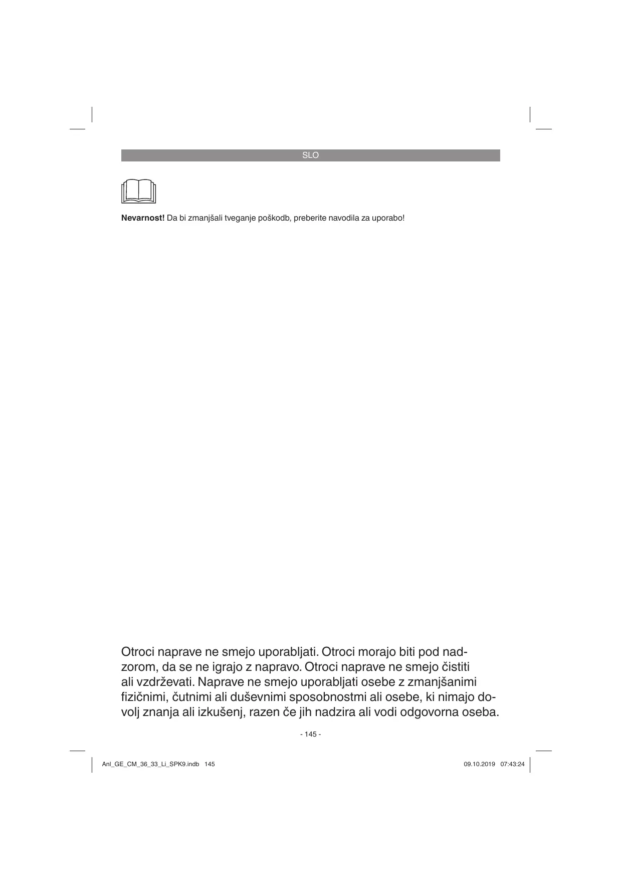 SLO Nevarnost! Da bi zmanjšali tveganje poškodb, preberite navodila za uporabo!