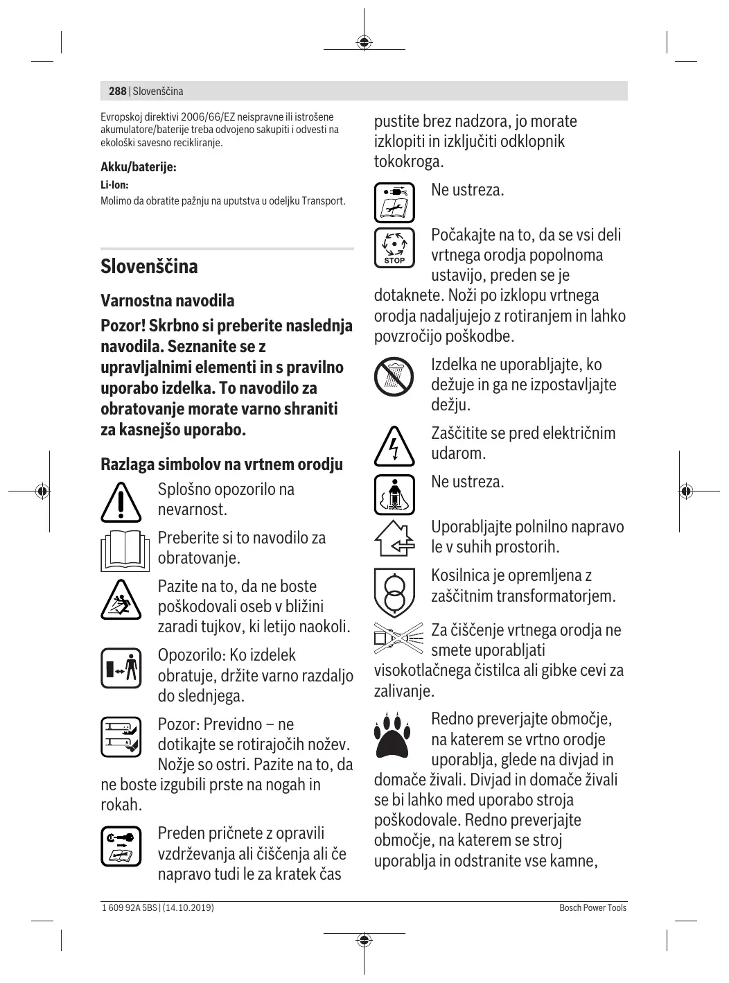 Servis i saveti za upotrebu www.bosch-garden.com Molimo da kod svih pitanja i poručivanja rezervnih delova neizostavno navedete broj artikla sa 10 brojčanih mesta prema tipskoj pločici proizvoda. Srpski Bosch Elektroservis Dimitrija Tucovića 59 11000 Beograd Tel.: +381 11 644 8546 Tel.: +381 11 744 3122 Tel.: +381 11 641 6291 Fax: +381 11 641 6293 E-Mail: office@servis-bosch.rs www.bosch-pt.rs Keller d.o.o. Ljubomira Nikolica 29 Bosch Power Tools Proverite mrežni napon, po potrebi zatražite od ovlašćene korisničke službe za električne alate firme Bosch da proveri punjač 18000 Nis Tel./Fax: +381 18 274 030 Tel./Fax: +381 18 531 798 E-Mail: office@keller-nis.com www.bosch-pt.rs Pro Servis NS d.o.o. Temerinski put 17 21000 Novi Sad Tel./Fax: +381 21 419-546 E-Mail: office@proservis.rs www.proservis.rs Bosnia Elektro-Servis Vl. Mehmed Nalić Dzemala Bijedića bb 71000 Sarajevo Tel./Fax: +387 33454089 E-Mail: bosch@bih.net.ba Transport Akumulatori koji sadrže litijum jon podležu zahtevima prava o opasnim materijama. Akumulatore može korisnik transportovati na putu bez drugih pakovanja. Pri slanju preko trećih lica (na primer vazdušni transport ili špedicija) mora se obratiti pažnja na posebne zahteve u pogledu pakovanja i označavanja. Ovde se mora pozvati kod pripreme komada za slanje i ekspert za opasne materije. Šaljite akumulatore samo ako je kućićšte neoštećeno. Otvorene kontakte odlepite i tako upakujte akumulator da se u pakovanju ne pokreće. Molimo da obratite pažnju i na eventualne dodatne nacionalne propise. Uklanjanje djubreta Baštenske uređaje, akumulatore, pribor i pakovanja treba odvesti na ekološki savesno recikliranje. Ne bacajte baštenske uređaje i akumulatore/ baterije u kućni otpad! Samo za EU‑zemlje: Prema Evropskoj direktivi 2012/19/EU električne i elektronske uređaje koji nisu više upotrebljivi, a prema 1 609 92A 5BS | (14.10.2019) 288 | Slovenščina Evropskoj direktivi 2006/66/EZ neispravne ili istrošene akumulatore/baterije treba odvojeno sakupiti i odvesti na ekološki savesno recikliranje. Akku/baterije: Li-Ion: Molimo da obratite pažnju na uputstva u odeljku Transport. Slovenščina Varnostna navodila Pozor! Skrbno si preberite naslednja navodila. Seznanite se z upravljalnimi elementi in s pravilno uporabo izdelka. To navodilo za obratovanje morate varno shraniti za kasnejšo uporabo. Razlaga simbolov na vrtnem orodju Splošno opozorilo na nevarnost. Preberite si to navodilo za obratovanje. Pazite na to, da ne boste poškodovali oseb v bližini zaradi tujkov, ki letijo naokoli. Opozorilo: Ko izdelek obratuje, držite varno razdaljo do slednjega. Pozor: Previdno – ne dotikajte se rotirajočih nožev. Nožje so ostri. Pazite na to, da ne boste izgubili prste na nogah in rokah. Preden pričnete z opravili vzdrževanja ali čiščenja ali če napravo tudi le za kratek čas 1 609 92A 5BS | (14.10.2019) pustite brez nadzora, jo morate izklopiti in izključiti odklopnik tokokroga. Ne ustreza. Počakajte na to, da se vsi deli vrtnega orodja popolnoma ustavijo, preden se je dotaknete. Noži po izklopu vrtnega orodja nadaljujejo z rotiranjem in lahko povzročijo poškodbe. Izdelka ne uporabljajte, ko dežuje in ga ne izpostavljajte dežju. Zaščitite se pred električnim udarom. Ne ustreza. Uporabljajte polnilno napravo le v suhih prostorih. Kosilnica je opremljena z zaščitnim transformatorjem. Za čiščenje vrtnega orodja ne smete uporabljati visokotlačnega čistilca ali gibke cevi za zalivanje. Redno preverjajte območje, na katerem se vrtno orodje uporablja, glede na divjad in domače živali. Divjad in domače živali se bi lahko med uporabo stroja poškodovale. Redno preverjajte območje, na katerem se stroj uporablja in odstranite vse kamne, Bosch Power Tools Slovenščina | 289 palice, žice, kosti in druge tujke. Pri uporabi stroja pazite na to, da se v travi ne skrivajo divjad, domače živali ali pa da se tam ne nahajajo majhni drevesni štori. Uporaba u Nikoli ne dovolite otrokom ali osebam, ki niso seznanjene s temi navodili, da bi uporabljale ta izdelek. Nacionalni predpisi morebiti omejujejo starost uporabnika. Kadar izdelek ni v uporabi, ga hranite izven dosega otrok. u Uporabe izdelka nikoli ne dovolite otrokom, osebam z omejenimi fizičnimi, senzoričnimi ali umskimi sposobnostmi ali pomanjkljivimi izkušnjami in/ali pomanjkljivim znanjem in/ali osebam, ki s temi navodili niso seznanjene. Nacionalni predpisi morebiti omejujejo starost uporabnika. u Nadzorujte otroke in zagotovite, da se slednji ne bodo igrali z izdelkom. u Nikoli ne uporabljajte naprave, ko se v neposredni bližini nahajajo osebe, še posebej otroci ali domače živali. u Za nezgode ali škodo, povzročeno na drugih osebah ali njihovi lastnini, je odgovoren uporabnik ali lastnik. u Med uporabo izdelka ne smete nositi odprtih gumijastih čevljev ali sandalov. Nosite le fiksno obutev in dolge hlače. Bosch Power Tools Skrbno preglejte površino, ki jo želite obdelati in odstranite kamne, palice, žice, kosti in druge tujke. u Pred pričetkom uporabe poglejte, ali so morda obrabljeni ali poškodovani noži, vijaki nožev ali rezilni skop. Da bi preprečili neuravnoteženost, morate obrabljene ali poškodovane nože ter vijake nožev zamenjati le v celotnem setu. u Kosite le pri dnevni svetlobi ali dobri umetni svetlobi. u Pri slabih vremenskih pogojih, še posebej pri bližajoči nevihti, ne smete delati s kosilnico. u Po možnosti ne uporabljajte vrtnega orodja, ko je trava mokra. u Vedno hodite mirno, nikoli ne tekajte. u Nikoli ne uporabljajte vrtnega orodja s poškodovanimi zaščitnimi pripravami, pokrovi ali brez varnostnih naprav, kot npr. odbojnika in/ali posode za prestrezanje trave. u Priporčamo vam, da za vašo lastno varnost nosite zaščito za sluh. u Izdelka ne uporabljajte, kadar ste zaspani ali bolni ali pod vplivom alkohola, drog ali zdravil. u Delo na pobočjih je lahko nevarno: – Ne kosite tam, kjer so pobočja zelo strma. 