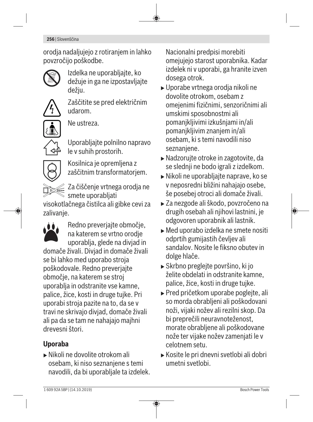 Bosch Power Tools transportom vrtnega orodja k površinam, ki jih želite pokositi. u Ne nagibajte vrtnega orodja pri startu ali vklopu motorja. u Vklopite vrtno orodje, kot je opisano v navodilu za obratovanje in pazite na to, da se bodo vaše noge nahajale dovolj daleč stran od rotirajočih se delov. u Poskrbite za to, da se roki in nogi ne nahajata v bližini ali pod rotirajočimi deli. u Pri delu z vrtnim orodjem se ne približujte se področju izmeta. u Nikoli ne vzdigujte oz. ne nosite vrtnega orodja z vklopljenim motorjem. u Pazite na to, da se bodo med skladiščenjem vrtnega orodja nahajala vsa 4 kolesa na tleh. u Vrtno orodje smete privzdigniti izključno z nosilnim ročajem. Nosilni ročaj uporabljajte previdno. u Izdelka ne smete spreminjati. Nedovoljene spremembe lahko negativno vplivajo na varnost vašega vrtnega orodja in povzročijo povečanje hrupa in vibracije. Zbiranje listja Nož za zbiranje listja je izoblikovan tako, da Vam omogoča pobiranje listja s trate. Da boste s to funkcijo dosegli karseda najboljši rezultat, se morate držati naslednjih napotkov: – Zbirajte listje le pri maksimalni rezalni višini. 1 609 92A 5BP | (14.10.2019) 258 | Slovenščina – Zbirajte listje le s trate. – Pred pričetkom zbiranja listja preglejte delovno površino in poskrbite za dovolj veliko razdaljo do ljudi, domačih živali, steklenih predmetov in avtomobilov. Sprostitev odklopnika tokokroga – Vedno, ko se oddaljite od vrtnega orodja. – Pred odstranitvijo blokad. – Med kontrolo ali čiščenjem vrtnega orodja oz. ko neposredno delate na vrtnem orodju. – Po koliziji s tujkom; takoj preverite vrtno orodje glede na poškodbe in če je potrebno, zamenjajte nož. – Če vrtno orodje prične nenavadno vibrirati (takojšnja kontrola). Vzdrževanje u Vselej nosite vrtne rokavice, ko rokujete z ostrimi noži ali delate na področju ostrih nožev. u Za zagotovitev varnega dela z izdelkom poskrbite za trdni nased vseh matic, sornikov in vijakov. u Redno preverjajte brezhibnost stanja in obrabljenost košare za prestrezanje trave. u Preverite izdelek in iz varnostnih razlogov nadomestite obrabljene ali poškodovane dele. u Uporabljajte le tiste rezalne nože, ki so predvideni za to vrtno orodje. u Poskrbite, da bodo vsi deli, ki jih boste zamenjali, izdelani pri podjetju Bosch. 1 609 92A 5BP | (14.10.2019)