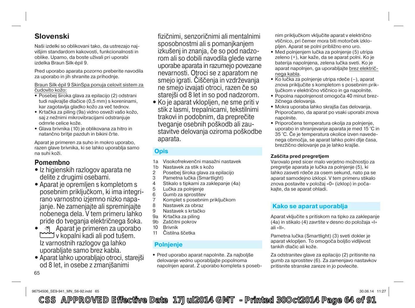 B Passez doucement la brosse exfoliante en mouvements circulaires sur votre peau pour affiner le grain de peau en douceur. Evitez de maintenir la brosse sur la même zone pendant une durée prolongée. N’utilisez pas la brosse exfoliante sur votre visage. L’utilisation régulière de la brosse exfoliante (ex : une fois par semaine) aide à limiter le risque de poils incarnés : les cellules mortes sont retirées permettant ainsi aux poils fins de ne pas rester bloqués sous la peau. Nous vous recommandons de vous exfolier au moins 1 à 2 jours avant de vous épiler. C Nettoyage de la brosse exfoliante Apres utilisation, rincez la brosse exfoliante sous l’eau. Vous pouvez utiliser du savon liquide si besoin. Secouez la brosse pour égoutter l’excès d’eau et laissez-la sécher. Placez le capot de protection (9b) avant de ranger la brosse. D Remplacer la brosse exfoliante Lors d’une utilisation hebdomadaire, nous vous recommandons de remplacer la brosse (9a) au bout de 12 mois. Les recharges de brosse (ref. no. 79 Spa) sont disponibles chez votre revendeur ou dans le Centres Service Agrées Braun ou via www.service.braun.com.