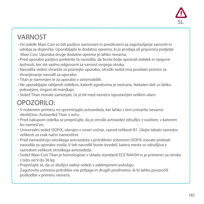 • Pour l’utilisation du système d’attache ISOFIX lisez IMPÉRATIVEMENT le manuel d’utilisation du véhicule, avant d’installer votre siège pour enfant. Il vous indiquera les places compatibles avec la classe de taille du siège pour enfant. • Titan de Maxi cosi a été approuvé selon les normes ECE R44 / 04 et convient aux enfants de 9 à 36 kg • Assurez-vous que le siège arrière rabattable est verrouillé. • L’utilisateur doit toujours veiller à ce que les bagages et autres objets susceptibles de causer des blessures à l’occupant du siège en cas de choc soient solidement arrimés.