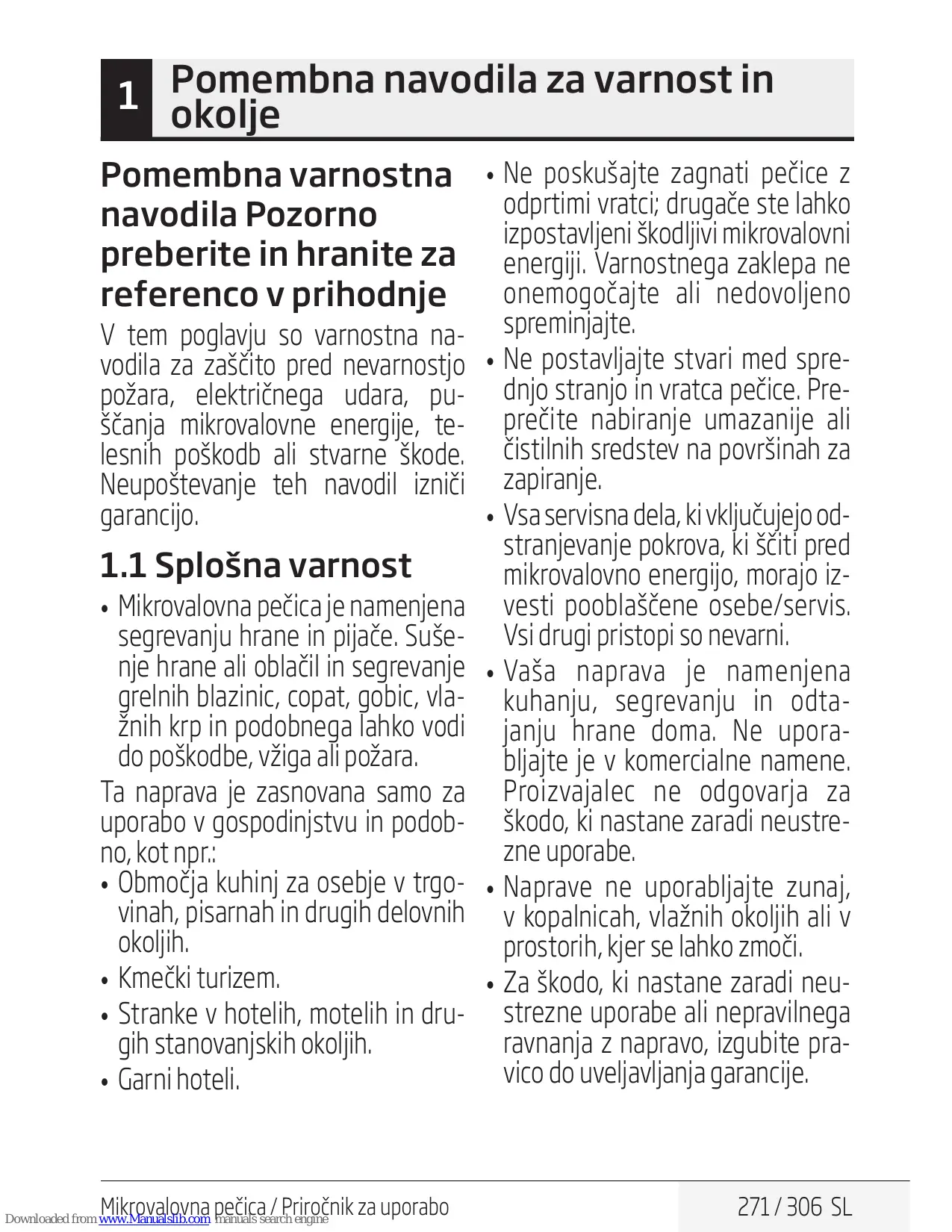 - • Mikrovalovna pečica je namenjena le vgrajeni uporabi. Mikrovalovna pečica / Priročnik za uporabo Downloaded from www.Manualslib.com manuals search engine 275 / 306 SL omembna navodila za varnost in 1 P okolje