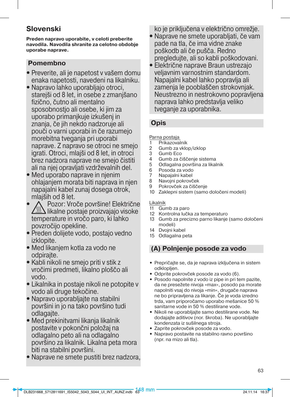 ‹‹Los electrodomésticos Braun cumplen todos los estándares de seguridad aplicables. De la reparación o sustitución del cable de red únicamente debe encargarse personal de servicio técnico autorizado. Un trabajo de reparación inadecuado y no profesional puede resultar en un considerable peligro para el usuario. Descripción Centro de planchado al vapor 1 Pantalla 2 Botón de encendido/apagado 6 Depósito de agua 7 Cable de alimentación 8 Tapón roscado 9 Tapón de limpieza 10 Sistema de bloqueo (solo en algunos modelos) Plancha 11 Botón de vapor 12 Luz de control de temperatura 13 Botón de golpe con precisión (solo en algunos modelos) 14 Cable doble 15 Parte trasera de apoyo