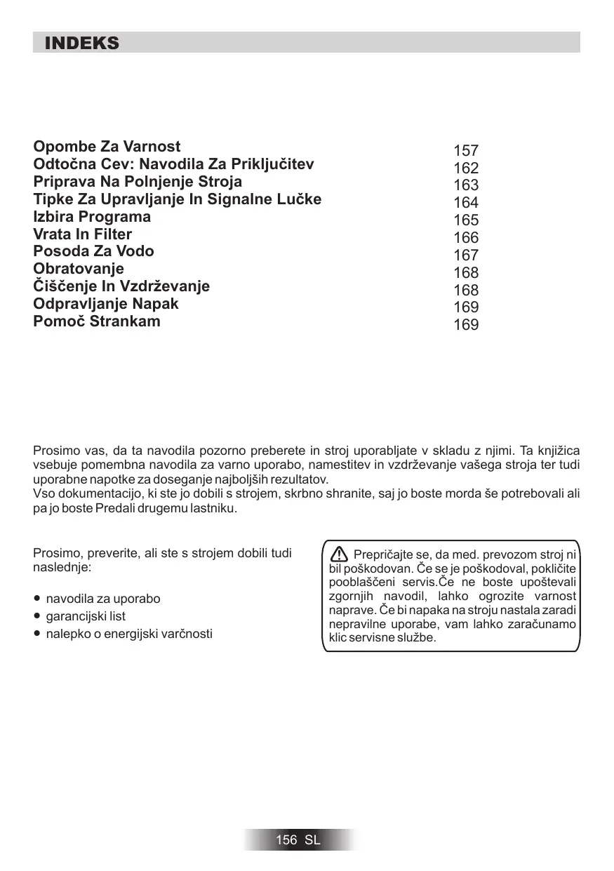 Prosimo vas, da ta navodila pozorno preberete in stroj uporabljate v skladu z njimi. Ta knjižica vsebuje pomembna navodila za varno uporabo, namestitev in vzdrževanje vašega stroja ter tudi uporabne napotke za doseganje najboljših rezultatov. Vso dokumentacijo, ki ste jo dobili s strojem, skrbno shranite, saj jo boste morda še potrebovali ali pa jo boste Predali drugemu lastniku. Prosimo, preverite, ali ste s strojem dobili tudi naslednje: ● navodila za uporabo ● garancijski list ● nalepko o energijski varčnosti 156 SL Prepričajte se, da med. prevozom stroj ni bil poškodovan. Če se je poškodoval, pokličite pooblaščeni servis.Če ne boste upoštevali zgornjih navodil, lahko ogrozite varnost naprave. Če bi napaka na stroju nastala zaradi nepravilne uporabe, vam lahko zaračunamo klic servisne službe.