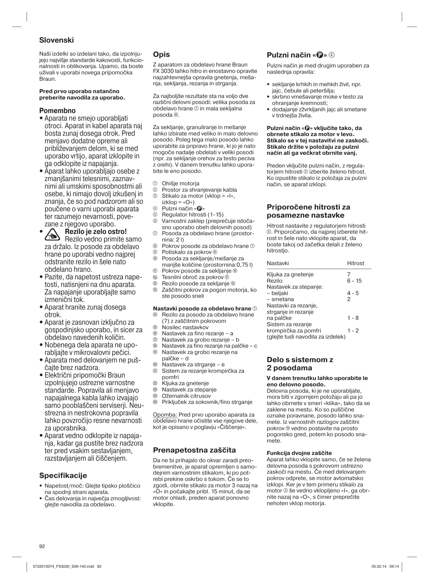- Čas delovanja in največja zmogljivost: glejte navodila za obdelavo. Opis Pulzni način «» 4 Z aparatom za obdelavo hrane Braun FX 3030 lahko hitro in enostavno opravite najzahtevnejša opravila gnetenja, mešanja, sekljanja, rezanja in strganja. Pulzni način je med drugim uporaben za naslednja opravila: Za najboljše rezultate sta na voljo dve različni delovni posodi: velika posoda za obdelavo hrane 7 in mala sekljalna posoda 0. Za sekljanje, granuliranje in mešanje lahko izbirate med veliko in malo delovno posodo. Poleg tega malo posodo lahko uporabite za pripravo hrane, ki jo je nato mogoče nadalje obdelati v veliki posodi (npr. za sekljanje orehov za testo peciva z orehi). V danem trenutku lahko uporabite le eno posodo. 1 Ohišje motorja 2 Prostor za shranjevanje kabla 3 Stikalo za motor (vklop = «I», izklop = «O») 4 Pulzni način «» 5 Regulator hitrosti (1-15) 6 Varnostni zaklep (preprečuje istočasno uporabo obeh delovnih posod) 7 Posoda za obdelavo hrane (prostornina: 2 l) 8 Pokrov posode za obdelavo hrane 7 9 Potiskalo za pokrov 8 0 Posoda za sekljanje/mešanje za manjše količine (prostornina:0,75 l) q Pokrov posode za sekljanje 0 11a Tesnilni obroč za pokrov q w Rezilo posode za sekljanje 0 e Zaščitni pokrov za pogon motorja, ko ste posodo sneli Nastavki posode za obdelavo hrane 7 r Rezilo za posodo za obdelavo hrane (7) z zaščitnim pokrovom t Nosilec nastavkov z Nastavek za fino rezanje – a u Nastavek za grobo rezanje – b i Nastavek za fino rezanje na palčke – c o Nastavek za grobo rezanje na palčke – d p Nastavek za strganje – e a Sistem za rezanje krompirčka za pomfri s Kljuka za gnetenje d Nastavek za stepanje f Ožemalnik citrusov g Priključek za sokovnik/fino strganje Opomba: Pred prvo uporabo aparata za obdelavo hrane očistite vse njegove dele, kot je opisano v poglavju »Čiščenje«. Prenapetostna zaščita Da ne bi prihajalo do okvar zaradi preobremenitve, je aparat opremljen s samodejnim varnostnim stikalom, ki po potrebi prekine oskrbo s tokom. Če se to zgodi, obrnite stikalo za motor 3 nazaj na »O« in počakajte pribl. 15 minut, da se motor ohladi, preden aparat ponovno vklopite.
