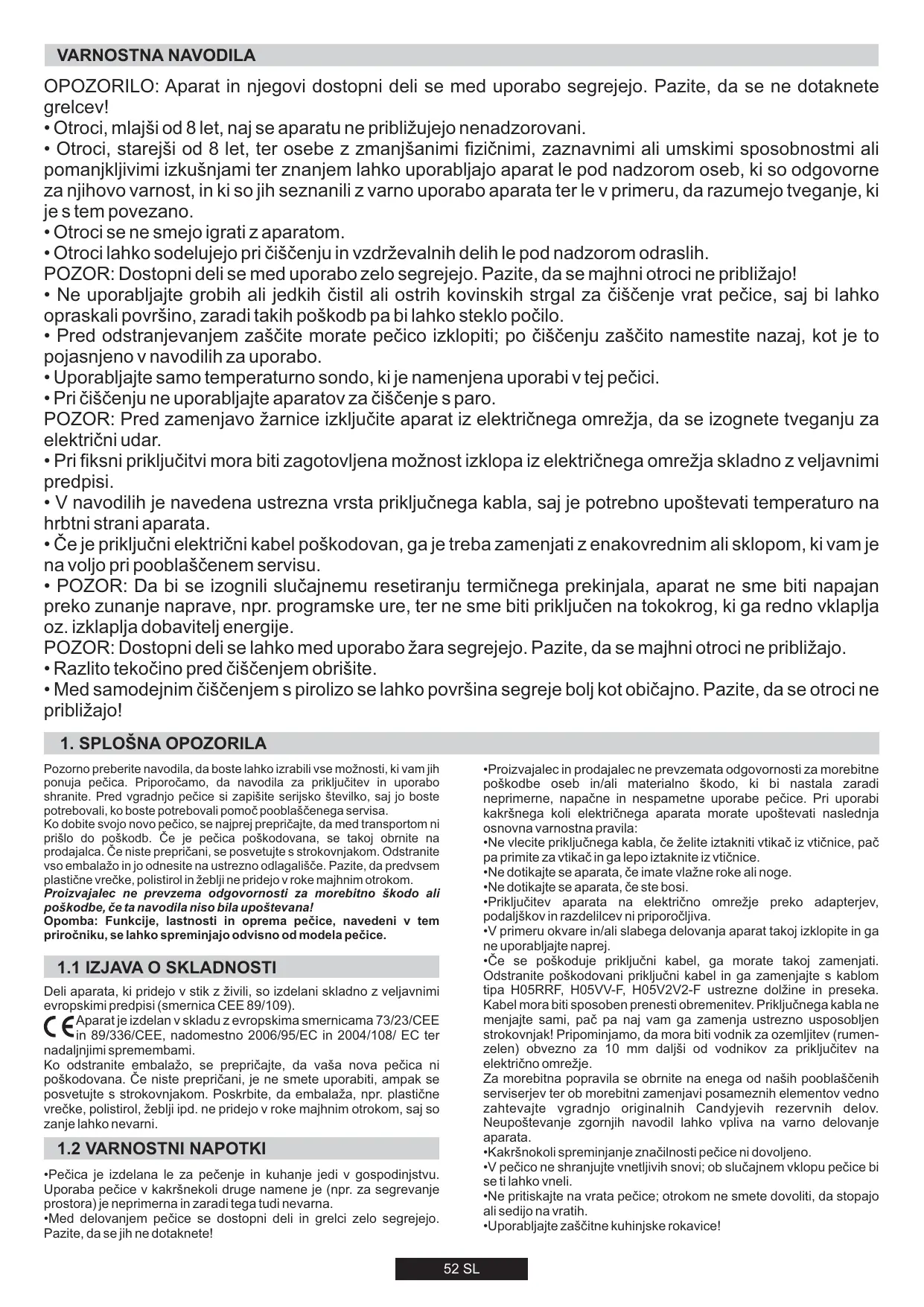 1.1 IZJAVA O SKLADNOSTI Deli aparata, ki pridejo v stik z živili, so izdelani skladno z veljavnimi evropskimi predpisi (smernica CEE 89/109). Aparat je izdelan v skladu z evropskima smernicama 73/23/CEE in 89/336/CEE, nadomestno 2006/95/EC in 2004/108/ EC ter nadaljnjimi spremembami. Ko odstranite embalažo, se prepričajte, da vaša nova pečica ni poškodovana. Če niste prepričani, je ne smete uporabiti, ampak se posvetujte s strokovnjakom. Poskrbite, da embalaža, npr. plastične vrečke, polistirol, žeblji ipd. ne pridejo v roke majhnim otrokom, saj so zanje lahko nevarni.