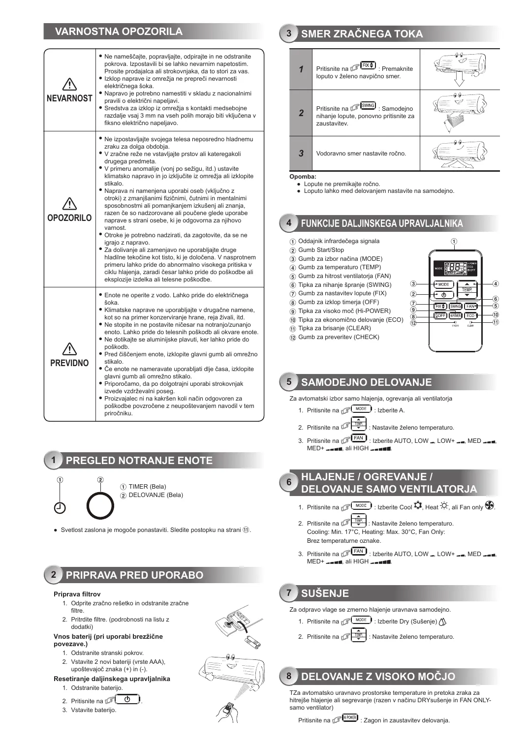 ● Ne nameščajte, popravljajte, odpirajte in ne odstranite pokrova. Izpostavili bi se lahko nevarnim napetostim. Prosite prodajalca ali strokovnjaka, da to stori za vas. ● Izklop naprave iz omrežja ne prepreči nevarnosti električnega šoka. ● Napravo je potrebno namestiti v skladu z nacionalnimi pravili o električni napeljavi. ● Sredstva za izklop iz omrežja s kontakti medsebojne razdalje vsaj 3 mm na vseh polih morajo biti vključena v fiksno električno napeljavo. ● Ne izpostavljajte svojega telesa neposredno hladnemu zraku za dolga obdobja. ● V zračne reže ne vstavljajte prstov ali kateregakoli drugega predmeta. ● V primeru anomalije (vonj po sežigu, itd.) ustavite klimatsko napravo in jo izključite iz omrežja ali izklopite stikalo. ● Naprava ni namenjena uporabi oseb (vključno z otroki) z zmanjšanimi fizičnimi, čutnimi in mentalnimi sposobnostmi ali pomanjkanjem izkušenj ali znanja, razen če so nadzorovane ali poučene glede uporabe naprave s strani osebe, ki je odgovorna za njihovo varnost. ● Otroke je potrebno nadzirati, da zagotovite, da se ne igrajo z napravo. ● Za dolivanje ali zamenjavo ne uporabljajte druge hladilne tekočine kot tisto, ki je določena. V nasprotnem primeru lahko pride do abnormalno visokega pritiska v ciklu hlajenja, zaradi česar lahko pride do poškodbe ali eksplozije izdelka ali telesne poškodbe. ● Enote ne operite z vodo. Lahko pride do električnega šoka. ● Klimatske naprave ne uporabljajte v drugačne namene, kot so na primer konzerviranje hrane, reja živali, itd. ● Ne stopite in ne postavite ničesar na notranjo/zunanjo enoto. Lahko pride do telesnih poškodb ali okvare enote. ● Ne dotikajte se aluminijske plavuti, ker lahko pride do poškodb. ● Pred čiščenjem enote, izklopite glavni gumb ali omrežno stikalo. ● Če enote ne nameravate uporabljati dlje časa, izklopite glavni gumb ali omrežno stikalo. ● Priporočamo, da po dolgotrajni uporabi strokovnjak izvede vzdrževalni poseg. ● Proizvajalec ni na kakršen koli način odgovoren za poškodbe povzročene z neupoštevanjem navodil v tem priročniku.