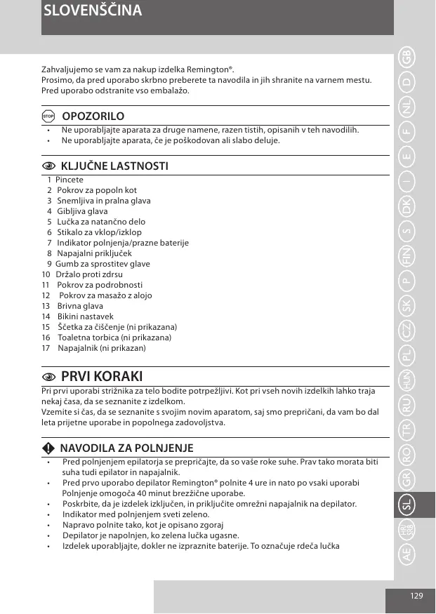 SLOVENŠČINA OPOMBA: Ta izdelek je namenjen samo za brezžično uporabo. Ko se depilator polni, ga ni mogoče vklopiti. Depilatorja ne poskušajte uporabiti, ko je priključen v omrežno vtičnico. Epilatorja ne morete preveč napolniti. Če izdelka ne boste uporabljali dalj časa (2-3 mesece), ga izključite iz električnega omrežja in shranite. Ko boste epilator želeli ponovno uporabiti, ga ponovno popolnoma napolnite.