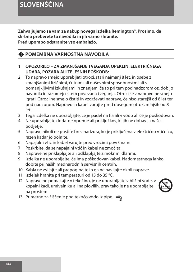 OPOZORILO – ZA ZMANJŠANJE TVEGANJA OPEKLIN, ELEKTRIČNEGA UDARA, POŽARA ALI TELESNIH POŠKODB: To napravo smejo uporabljati otroci, stari najmanj 8 let, in osebe z zmanjšanimi fizičnimi, čutnimi ali duševnimi sposobnostmi ali s pomanjkljivimi izkušnjami in znanjem, če so pri tem pod nadzorom oz. dobijo navodila in razumejo s tem povezana tveganja. Otroci se z napravo ne smejo igrati. Otroci ne smejo čistiti in vzdrževati naprave, če niso starejši od 8 let ter pod nadzorom. Napravo in kabel varujte pred dosegom otrok, mlajših od 8 let. Tega izdelka ne uporabljajte, če je padel na tla ali v vodo ali če je poškodovan. Ne uporabljajte dodatne opreme ali priključkov, ki jih ne dobavlja naše podjetje. Naprave nikoli ne pustite brez nadzora, ko je priključena v električno vtičnico, razen kadar jo polnite. Napajalni vtič in kabel varujte pred vročimi površinami. Poskrbite, da se napajalni vtič in kabel ne zmočita. Naprave ne priklapljajte ali odklapljajte z mokrimi dlanmi. Izdelka ne uporabljajte, če ima poškodovan kabel. Nadomestnega lahko dobite pri naših mednarodnih servisnih centrih. Kabla ne zvijajte ali prepogibajte in ga ne navijajte okoli naprave. Izdelek hranite pri temperaturi od 15 do 35 °C. Naprave ne pomakajte v tekočino, je ne uporabljajte v bližini vode, v kopalni kadi, umivalniku ali na plovilih, prav tako je ne uporabljajte na prostem. Primerno za čiščenje pod tekočo vodo iz pipe.