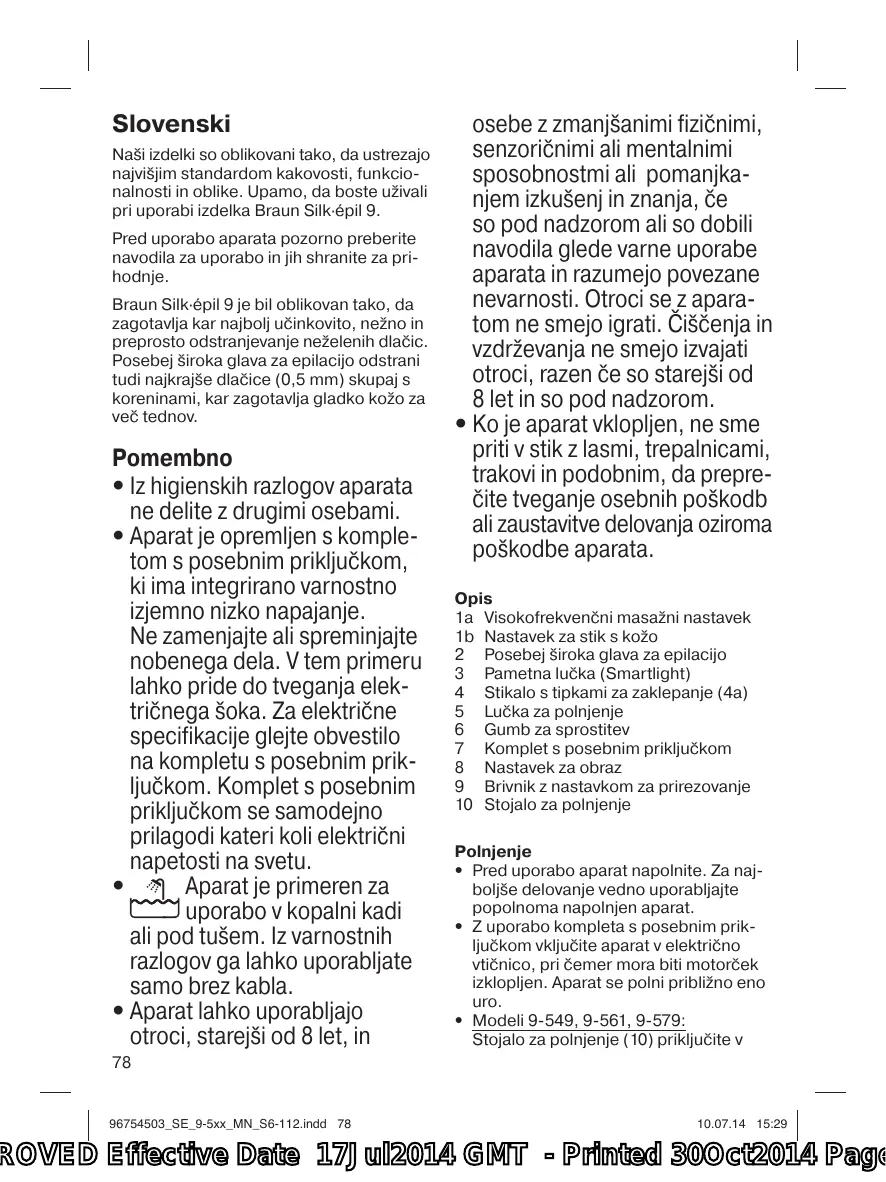 Slovenski Naši izdelki so oblikovani tako, da ustrezajo najvišjim standardom kakovosti, funkcionalnosti in oblike. Upamo, da boste uživali pri uporabi izdelka Braun Silk·épil 9. Pred uporabo aparata pozorno preberite navodila za uporabo in jih shranite za prihodnje. Braun Silk·épil 9 je bil oblikovan tako, da zagotavlja kar najbolj učinkovito, nežno in preprosto odstranjevanje neželenih dlačic. Posebej široka glava za epilacijo odstrani tudi najkrajše dlačice (0,5 mm) skupaj s koreninami, kar zagotavlja gladko kožo za več tednov.