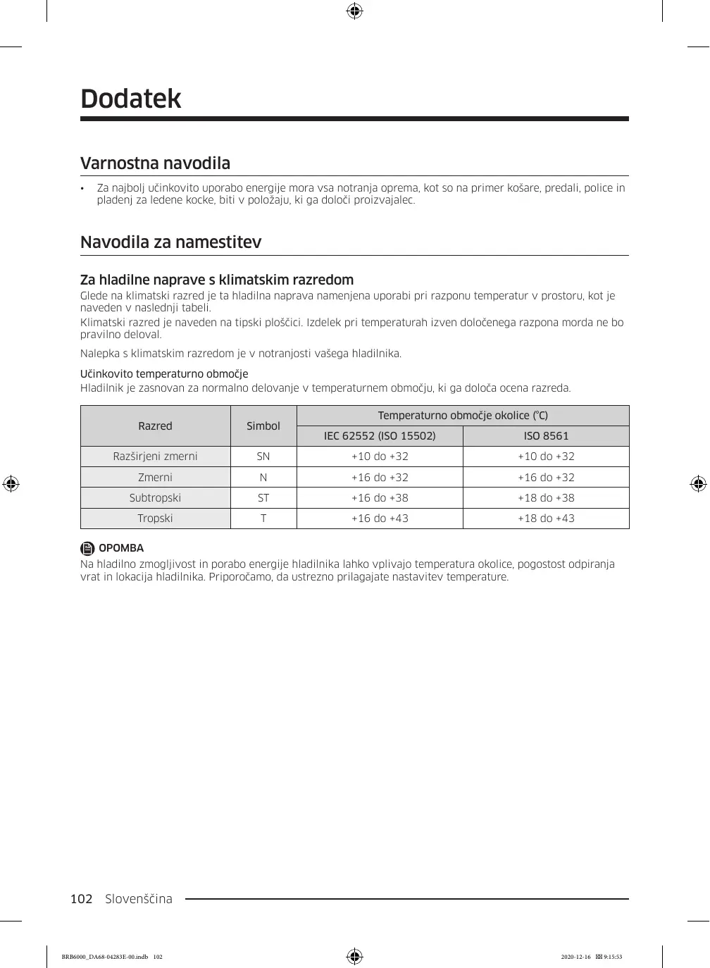 Za najbolj učinkovito uporabo energije mora vsa notranja oprema, kot so na primer košare, predali, police in pladenj za ledene kocke, biti v položaju, ki ga določi proizvajalec. Navodila za namestitev Za hladilne naprave s klimatskim razredom Glede na klimatski razred je ta hladilna naprava namenjena uporabi pri razponu temperatur v prostoru, kot je naveden v naslednji tabeli. Klimatski razred je naveden na tipski ploščici. Izdelek pri temperaturah izven določenega razpona morda ne bo pravilno deloval. Nalepka s klimatskim razredom je v notranjosti vašega hladilnika. Učinkovito temperaturno območje Hladilnik je zasnovan za normalno delovanje v temperaturnem območju, ki ga določa ocena razreda. Razred Simbol Razširjeni zmerni Zmerni Temperaturno območje okolice (°C) IEC 62552 (ISO 15502) ISO 8561