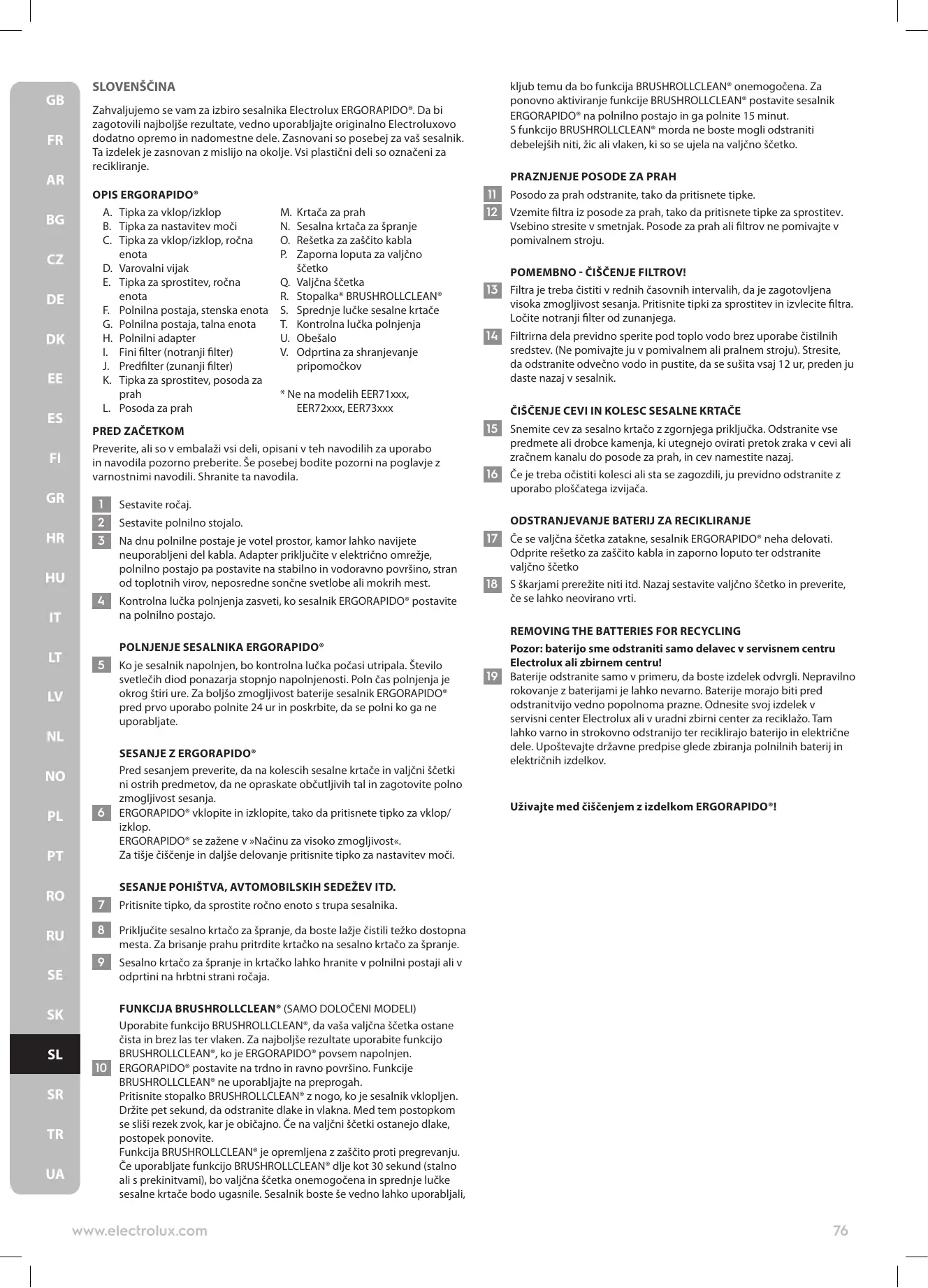 GB FR AR BG CZ DE DK EE ES FI GR HR SLOVENŠČINA Zahvaljujemo se vam za izbiro sesalnika Electrolux ERGORAPIDO®. Da bi zagotovili najboljše rezultate, vedno uporabljajte originalno Electroluxovo dodatno opremo in nadomestne dele. Zasnovani so posebej za vaš sesalnik. Ta izdelek je zasnovan z mislijo na okolje. Vsi plastični deli so označeni za recikliranje. OPIS ERGORAPIDO® A. Tipka za vklop/izklop B. Tipka za nastavitev moči C. Tipka za vklop/izklop, ročna enota D. Varovalni vijak E. Tipka za sprostitev, ročna enota F. Polnilna postaja, stenska enota G. Polnilna postaja, talna enota H. Polnilni adapter I. Fini filter (notranji filter) J. Predfilter (zunanji filter) K. Tipka za sprostitev, posoda za prah L. Posoda za prah