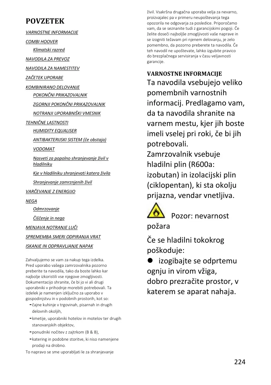 POVZETEK VARNOSTNE INFORMACIJE COMBI HOOVER Klimatski razred NAVODILA ZA PREVOZ NAVODILA ZA NAMESTITEV ZAČETEK UPORABE KOMBINIRANO DELOVANJE POKONČNI PRIKAZOVALNIK ZGORNJI POKONČNI PRIKAZOVALNIK NOTRANJI UPORABNIŠKI VMESNIK TEHNIČNE LASTNOSTI HUMIDITY EQUALISER ANTIBAKTERIJSKI SISTEM (če obstaja) VODOMAT Nasveti za popolno shranjevanje živil v hladilniku Kje v hladilniku shranjevati katera živila Shranjevanje zamrznjenih živil VARČEVANJE Z ENERGIJO NEGA