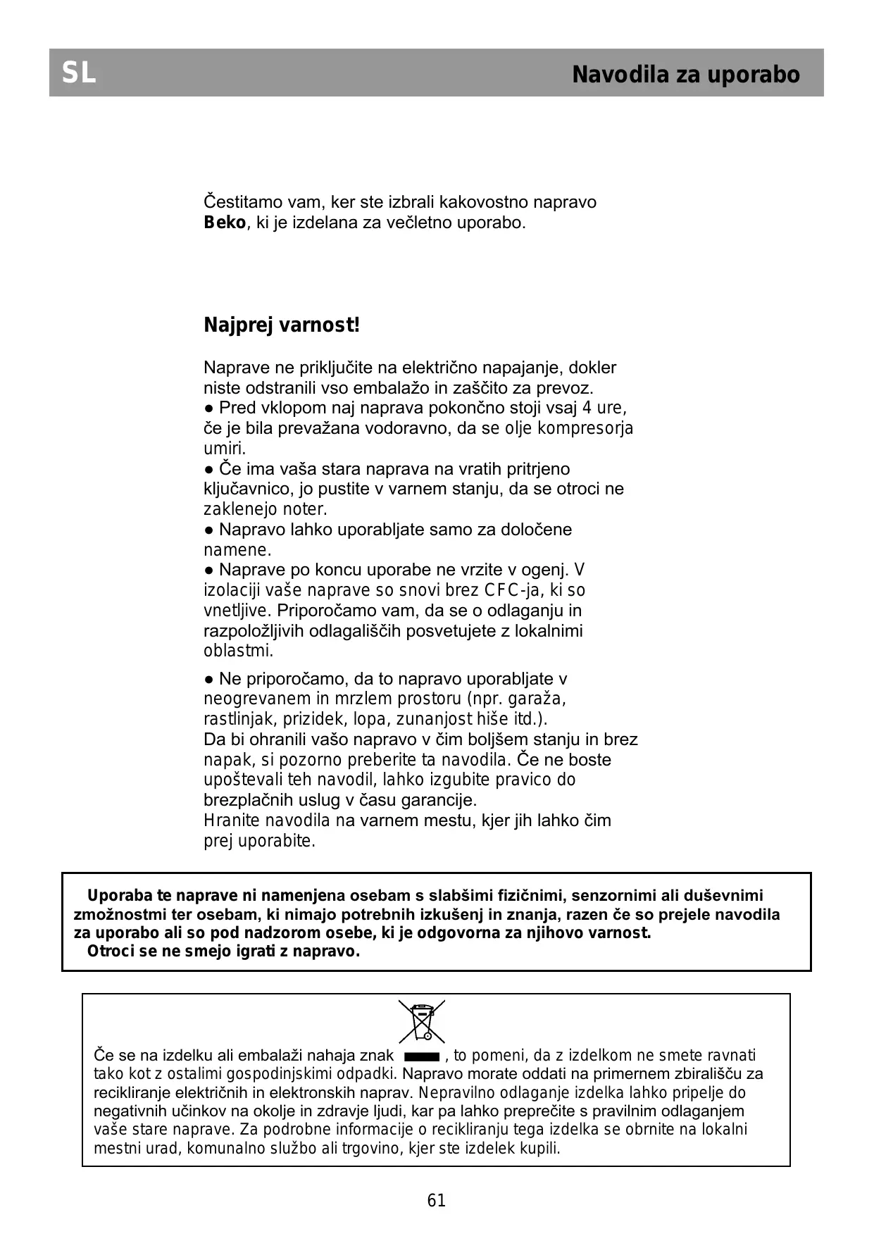 Navodila za uporabo Čestitamo vam, ker ste izbrali kakovostno napravo Beko, ki je izdelana za večletno uporabo. Najprej varnost! Naprave ne priključite na električno napajanje, dokler niste odstranili vso embalažo in zaščito za prevoz. ● Pred vklopom naj naprava pokončno stoji vsaj 4 ure, če je bila prevažana vodoravno, da se olje kompresorja umiri. ● Če ima vaša stara naprava na vratih pritrjeno ključavnico, jo pustite v varnem stanju, da se otroci ne zaklenejo noter. ● Napravo lahko uporabljate samo za določene namene. ● Naprave po koncu uporabe ne vrzite v ogenj. V izolaciji vaše naprave so snovi brez CFC-ja, ki so vnetljive. Priporočamo vam, da se o odlaganju in razpoložljivih odlagališčih posvetujete z lokalnimi oblastmi. ● Ne priporočamo, da to napravo uporabljate v neogrevanem in mrzlem prostoru (npr. garaža, rastlinjak, prizidek, lopa, zunanjost hiše itd.). Da bi ohranili vašo napravo v čim boljšem stanju in brez napak, si pozorno preberite ta navodila. Če ne boste upoštevali teh navodil, lahko izgubite pravico do brezplačnih uslug v času garancije. Hranite navodila na varnem mestu, kjer jih lahko čim prej uporabite. Uporaba te naprave ni namenjena osebam s slabšimi fizičnimi, senzornimi ali duševnimi zmožnostmi ter osebam, ki nimajo potrebnih izkušenj in znanja, razen če so prejele navodila za uporabo ali so pod nadzorom osebe, ki je odgovorna za njihovo varnost. Otroci se ne smejo igrati z napravo. Če se na izdelku ali embalaži nahaja znak , to pomeni, da z izdelkom ne smete ravnati tako kot z ostalimi gospodinjskimi odpadki. Napravo morate oddati na primernem zbirališču za recikliranje električnih in elektronskih naprav. Nepravilno odlaganje izdelka lahko pripelje do negativnih učinkov na okolje in zdravje ljudi, kar pa lahko preprečite s pravilnim odlaganjem vaše stare naprave. Za podrobne informacije o recikliranju tega izdelka se obrnite na lokalni mestni urad, komunalno službo ali trgovino, kjer ste izdelek kupili.