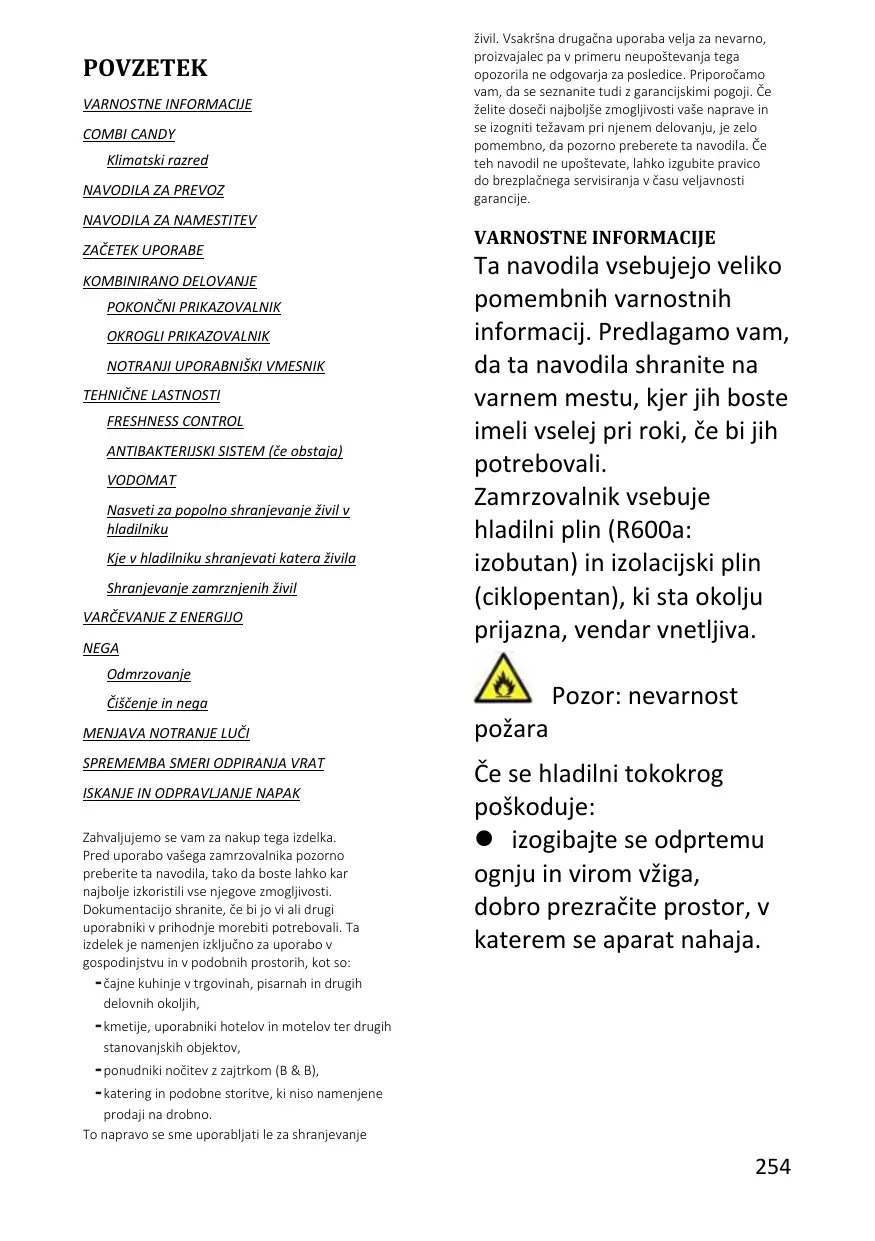 NEGA živil. Vsakršna drugačna uporaba velja za nevarno, proizvajalec pa v primeru neupoštevanja tega opozorila ne odgovarja za posledice. Priporočamo vam, da se seznanite tudi z garancijskimi pogoji. Če želite doseči najboljše zmogljivosti vaše naprave in se izogniti težavam pri njenem delovanju, je zelo pomembno, da pozorno preberete ta navodila. Če teh navodil ne upoštevate, lahko izgubite pravico do brezplačnega servisiranja v času veljavnosti garancije. VARNOSTNE INFORMACIJE Ta navodila vsebujejo veliko pomembnih varnostnih informacij. Predlagamo vam, da ta navodila shranite na varnem mestu, kjer jih boste imeli vselej pri roki, če bi jih potrebovali. Zamrzovalnik vsebuje hladilni plin (R600a: izobutan) in izolacijski plin (ciklopentan), ki sta okolju prijazna, vendar vnetljiva. Odmrzovanje Pozor: nevarnost Čiščenje in nega