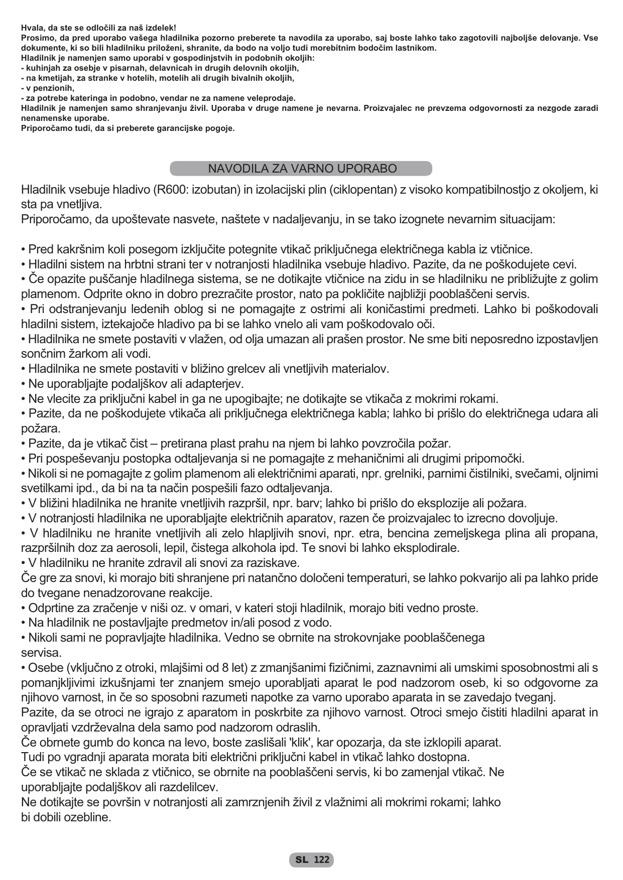 INFORMATIONS SUR LA SECURITE Le réfrigérateur contient un gaz réfrigérant (R660a : isobutane) et un gaz isolant (cyclopentane), dotés d'une compatibilité