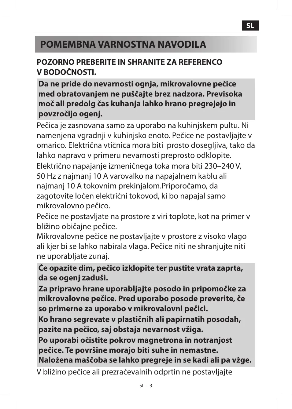 V BODOČNOSTI. Da ne pride do nevarnosti ognja, mikrovalovne pečice med obratovanjem ne puščajte brez nadzora. Previsoka moč ali predolg čas kuhanja lahko hrano pregrejejo in povzročijo ogenj. Pečica je zasnovana samo za uporabo na kuhinjskem pultu. Ni namenjena vgradnji v kuhinjsko enoto. Pečice ne postavljajte v omarico. Električna vtičnica mora biti prosto dosegljiva, tako da lahko napravo v primeru nevarnosti preprosto odklopite. Električno napajanje izmeničnega toka mora biti 230–240 V, 50 Hz z najmanj 10 A varovalko na napajalnem kablu ali najmanj 10 A tokovnim prekinjalom.Priporočamo, da zagotovite ločen električni tokovod, ki bo napajal samo mikrovalovno pečico. Pečice ne postavljate na prostore z viri toplote, kot na primer v bližino običajne pečice. Mikrovalovne pečice ne postavljajte v prostore z visoko vlago ali kjer bi se lahko nabirala vlaga. Pečice niti ne shranjujte niti ne uporabljate zunaj. Če opazite dim, pečico izklopite ter pustite vrata zaprta, da se ogenj zaduši. Za pripravo hrane uporabljajte posodo in pripomočke za mikrovalovne pečice. Pred uporabo posode preverite, če so primerne za uporabo v mikrovalovni pečici. Ko hrano segrevate v plastičnih ali papirnatih posodah, pazite na pečico, saj obstaja nevarnost vžiga. Po uporabi očistite pokrov magnetrona in notranjost pečice. Te površine morajo biti suhe in nemastne. Naložena maščoba se lahko pregreje in se kadi ali pa vžge. V bližino pečice ali prezračevalnih odprtin ne postavljajte SL – 3 vnetljivih materialov. Ne blokirajte prezračevalnih odprtin. S hrane in embalaže odstranite vse kovinske sponke, žice itd. Iskrenje kovinskih površin lahko povzroči ogenj. Mikrovalovne pečice ne uporabljajte za pogrevanje olja ali cvrtja. Temperature ni mogoče nadzorovati in olje se tako lahko vžge. Za pripravo pokovke uporabljate le posebno pokovko, ki je primerna za uporabo v mikrovalovni pečici. V pečici ne shranjujte hrane ali drugih stvari. Po vklopu pečice preverite nastavitve, da se prepričate, da pečica obratuje tako kot želite. Ko je pečica vključena, je ne smete pustiti nenadzorovane. Da preprečite pregrevanje in ogenj, morate biti še posebej pozorni pri kuhanju ali pogrevanju hrane z visokim deležem sladkorja ali maščobe, na primer meso v testu, pite ali božični puding. Glejte ustrezne napotke v navodilih za uporabo. Da se izognete tveganjem za poškodbe. OPOZORILO: Ne uporabljajte pečice, če je poškodovana ali okvarjena. Pred uporabo preverite naslednje: a) Prepričajte se, da so vrata pravilno zaprta in da niso povešena ali zvita. b) Preverite in prepričajte se, da varnostni zatiči vrat niso zlomljeni ali odviti. c) Prepričajte se, da tesnila vrat in tesnilne površine niso poškodovane. d) Prepričajte se, da v prostoru za kuhanje ali na vratih ni vdrtin. e) Prepričajte se, da napajalni kabel in vtič nista poškodovana. Če so vrata ali tesnila vrat poškodovana, ne smete uporabljati pečice, dokler je ne popravi usposobljen serviser. Nikoli sami ne prilagajajte, popravljajte ali spreminjajte pečice. Servis ali popravilo, ki vključuje odstranjevanje SL – 4