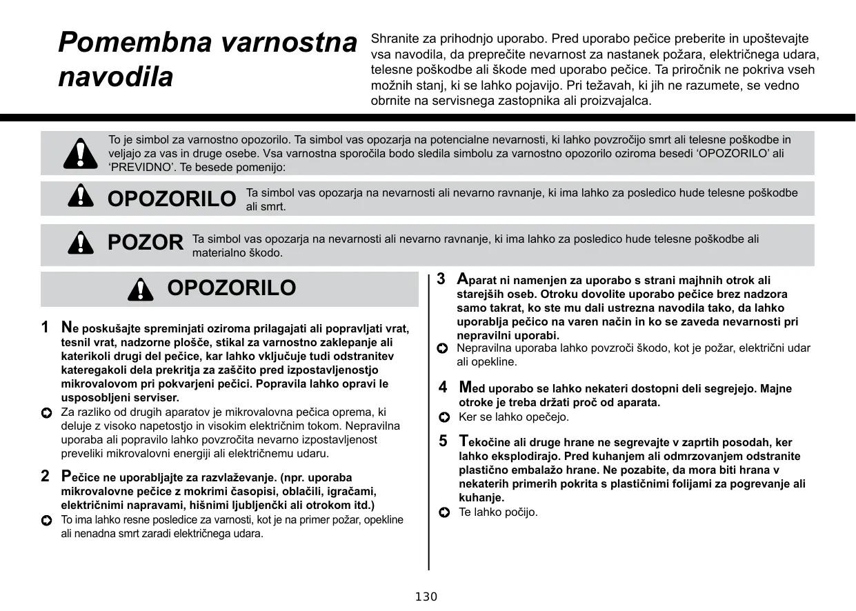 Shranite za prihodnjo uporabo. Pred uporabo pečice preberite in upoštevajte vsa navodila, da preprečite nevarnost za nastanek požara, električnega udara, telesne poškodbe ali škode med uporabo pečice. Ta priročnik ne pokriva vseh možnih stanj, ki se lahko pojavijo. Pri težavah, ki jih ne razumete, se vedno obrnite na servisnega zastopnika ali proizvajalca.