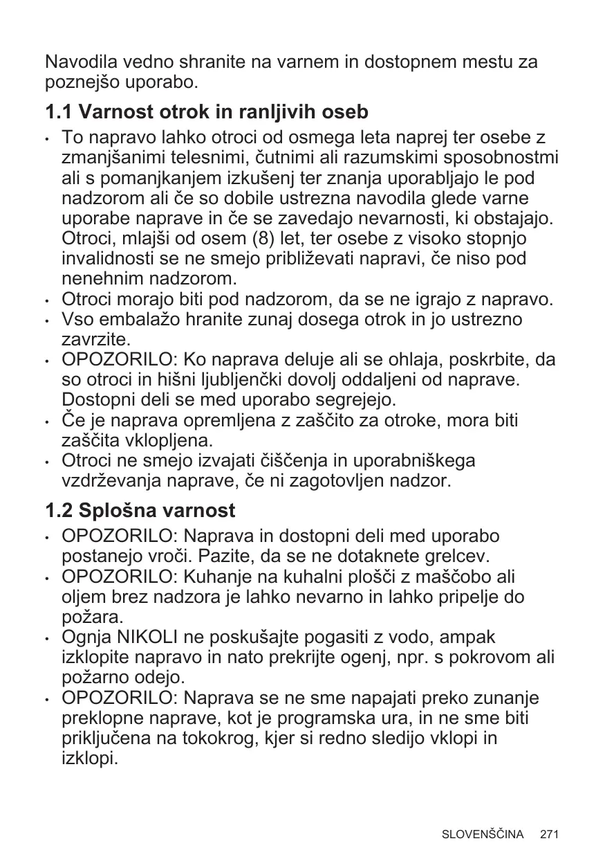 To napravo lahko otroci od osmega leta naprej ter osebe z zmanjšanimi telesnimi, čutnimi ali razumskimi sposobnostmi ali s pomanjkanjem izkušenj ter znanja uporabljajo le pod nadzorom ali če so dobile ustrezna navodila glede varne uporabe naprave in če se zavedajo nevarnosti, ki obstajajo. Otroci, mlajši od osem (8) let, ter osebe z visoko stopnjo invalidnosti se ne smejo približevati napravi, če niso pod nenehnim nadzorom. Otroci morajo biti pod nadzorom, da se ne igrajo z napravo. Vso embalažo hranite zunaj dosega otrok in jo ustrezno zavrzite. OPOZORILO: Ko naprava deluje ali se ohlaja, poskrbite, da so otroci in hišni ljubljenčki dovolj oddaljeni od naprave. Dostopni deli se med uporabo segrejejo. Če je naprava opremljena z zaščito za otroke, mora biti zaščita vklopljena. Otroci ne smejo izvajati čiščenja in uporabniškega vzdrževanja naprave, če ni zagotovljen nadzor.