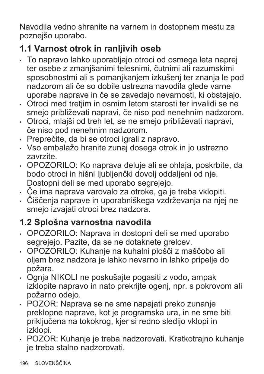 OPOZORILO: Naprava in dostopni deli se med uporabo segrejejo. Pazite, da se ne dotaknete grelcev. OPOZORILO: Kuhanje na kuhalni plošči z maščobo ali oljem brez nadzora je lahko nevarno in lahko pripelje do požara. Ognja NIKOLI ne poskušajte pogasiti z vodo, ampak izklopite napravo in nato prekrijte ogenj, npr. s pokrovom ali požarno odejo. POZOR: Naprava se ne sme napajati preko zunanje preklopne naprave, kot je programska ura, in ne sme biti priključena na tokokrog, kjer si redno sledijo vklopi in izklopi. POZOR: Kuhanje je treba nadzorovati. Kratkotrajno kuhanje je treba stalno nadzorovati.