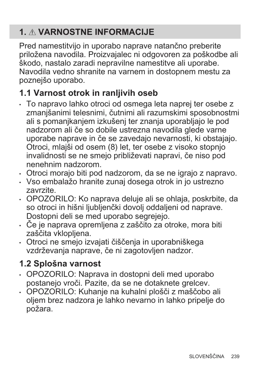 OPOZORILO: Naprava in dostopni deli med uporabo postanejo vroči. Pazite, da se ne dotaknete grelcev. OPOZORILO: Kuhanje na kuhalni plošči z maščobo ali oljem brez nadzora je lahko nevarno in lahko pripelje do požara. SLOVENŠČINA